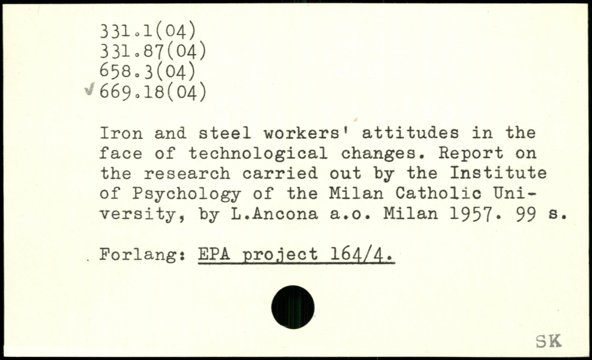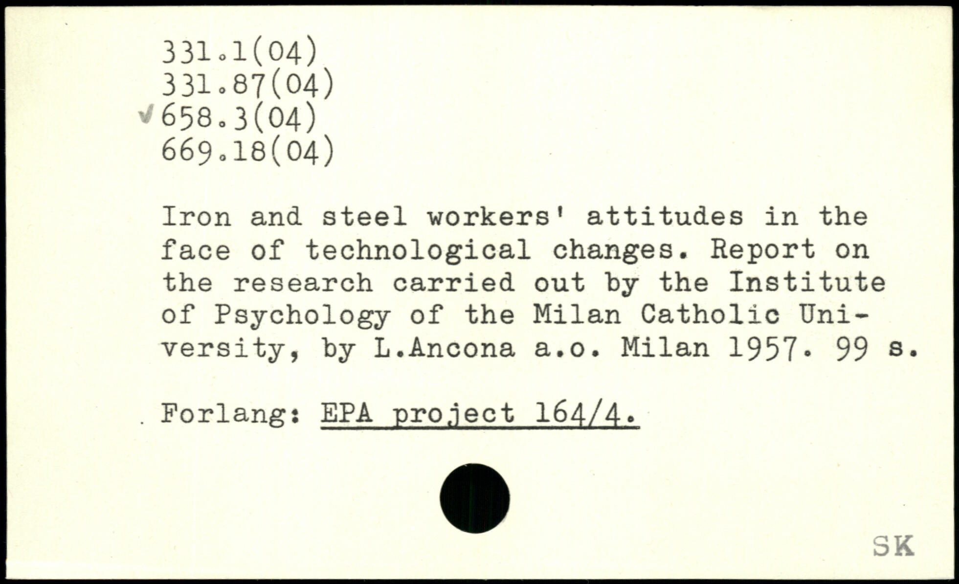Iron and steel workers' attitudes in the face of technological changes. Report on the research carried out by the Institute of Psychology of the Milan Catholic University, by L.Ancona a.o.