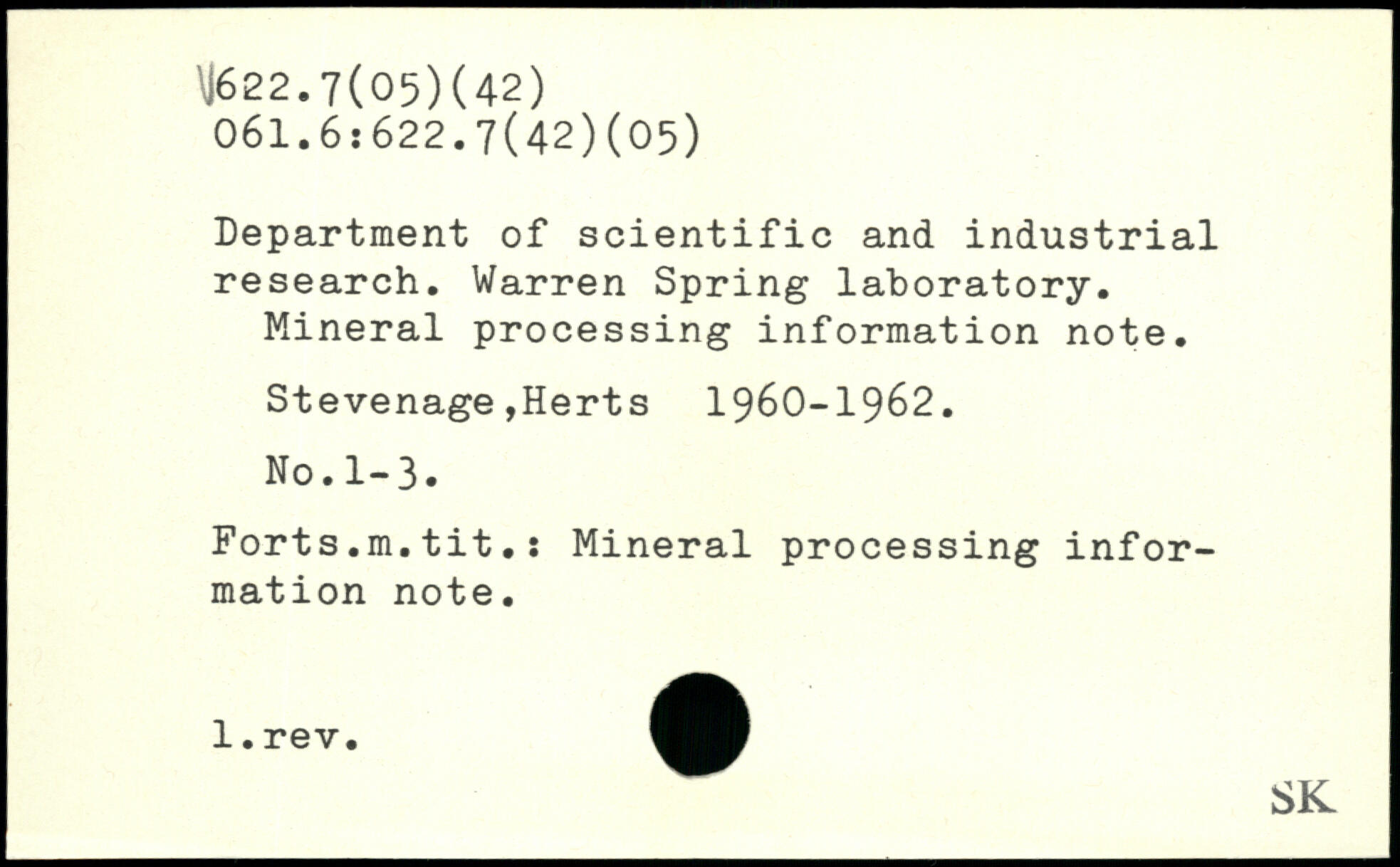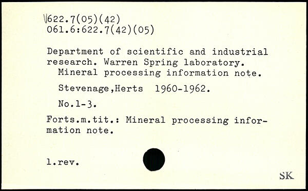 Department of scientific and industrial research. Warren Spring laboratory. Mineral processing information note. Stevenage,Herts 1960-1962. No.1-3. Forts.m.tit.î Mineral processing information note.