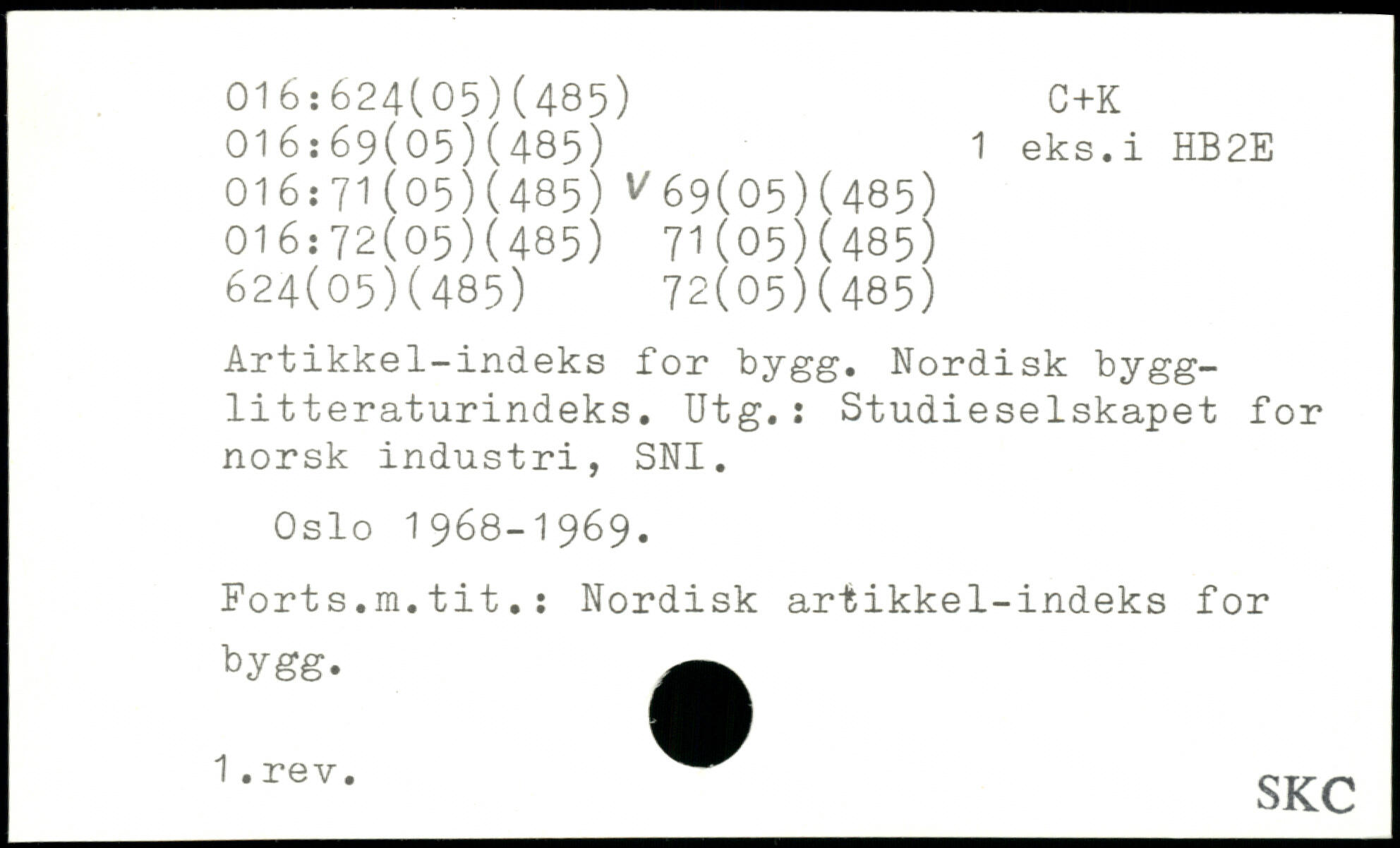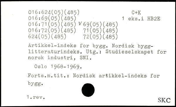 Artikkel-indeks for bygg. Nordisk bygg-litteraturindeks. Utg.: Studieselskapet for norsk industri, SNI. Oslo 1968-1969. Fort s.m.tit.: Nordisk artikkel-indeks for bygg. 1-rev- SKC
