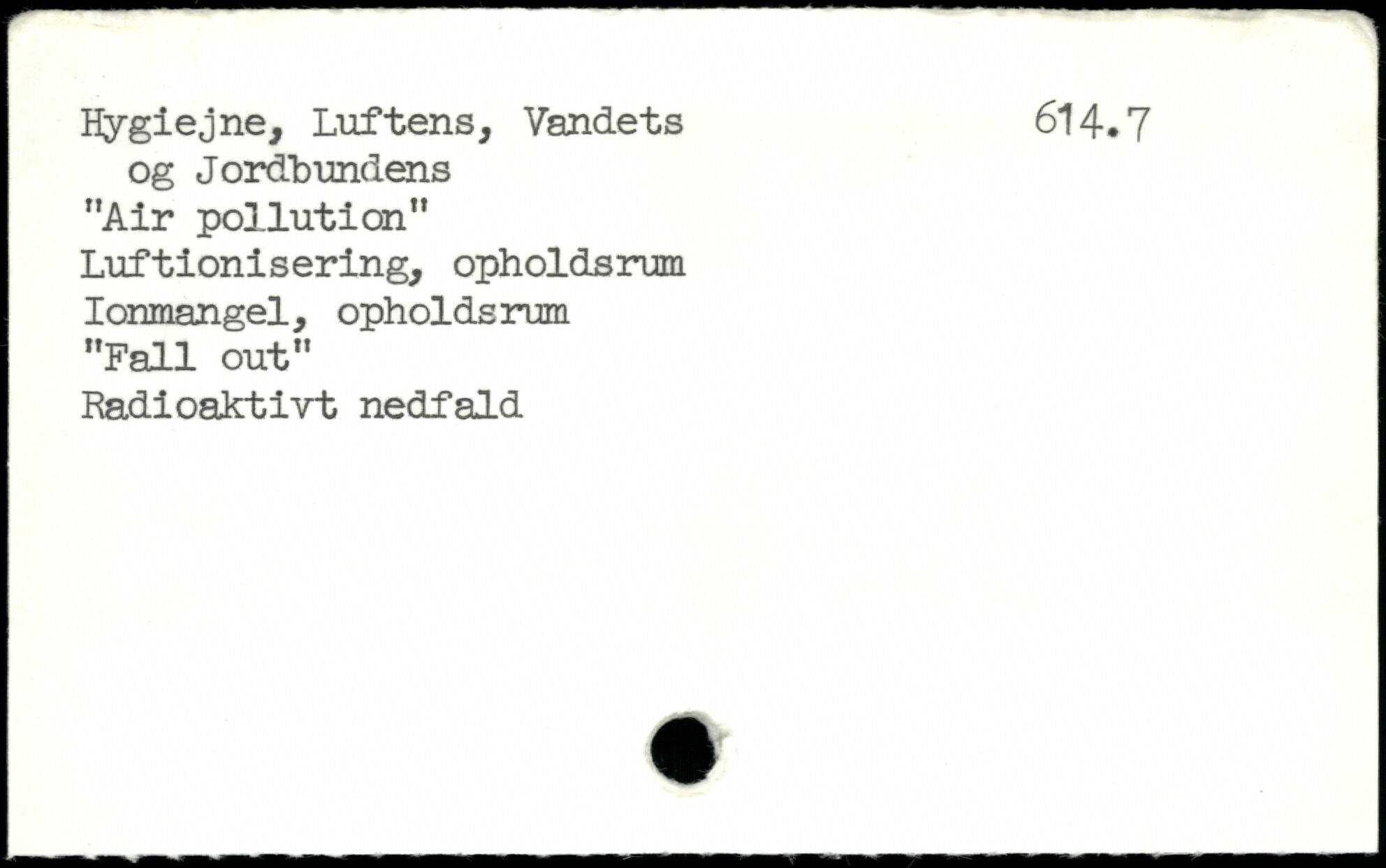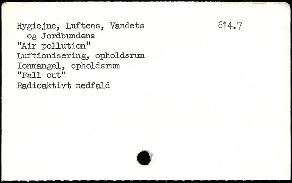 Hygiejne, Luftens, Vandets 614.7 og Jordbundens "Air pollution" Luftionisering, opholdsrum Ionmangel, opholdsrum "Fali out" Radioaktivt nedfald