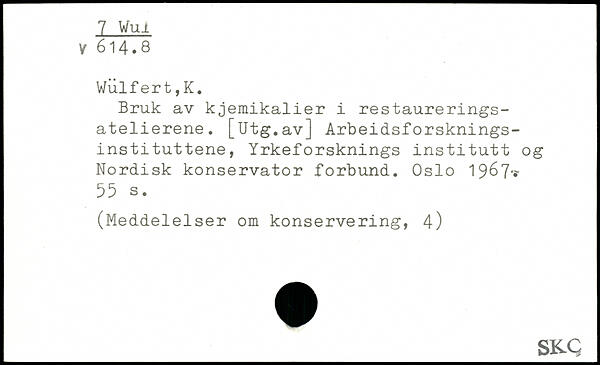 Bruk av kjemikalier i restaureringsatelierene. [Utg .av] Arbeidsforsknings- I instituttene, Yrkeforsknings institutt og Nordisk konservator forbund. Oslo 19^7'-