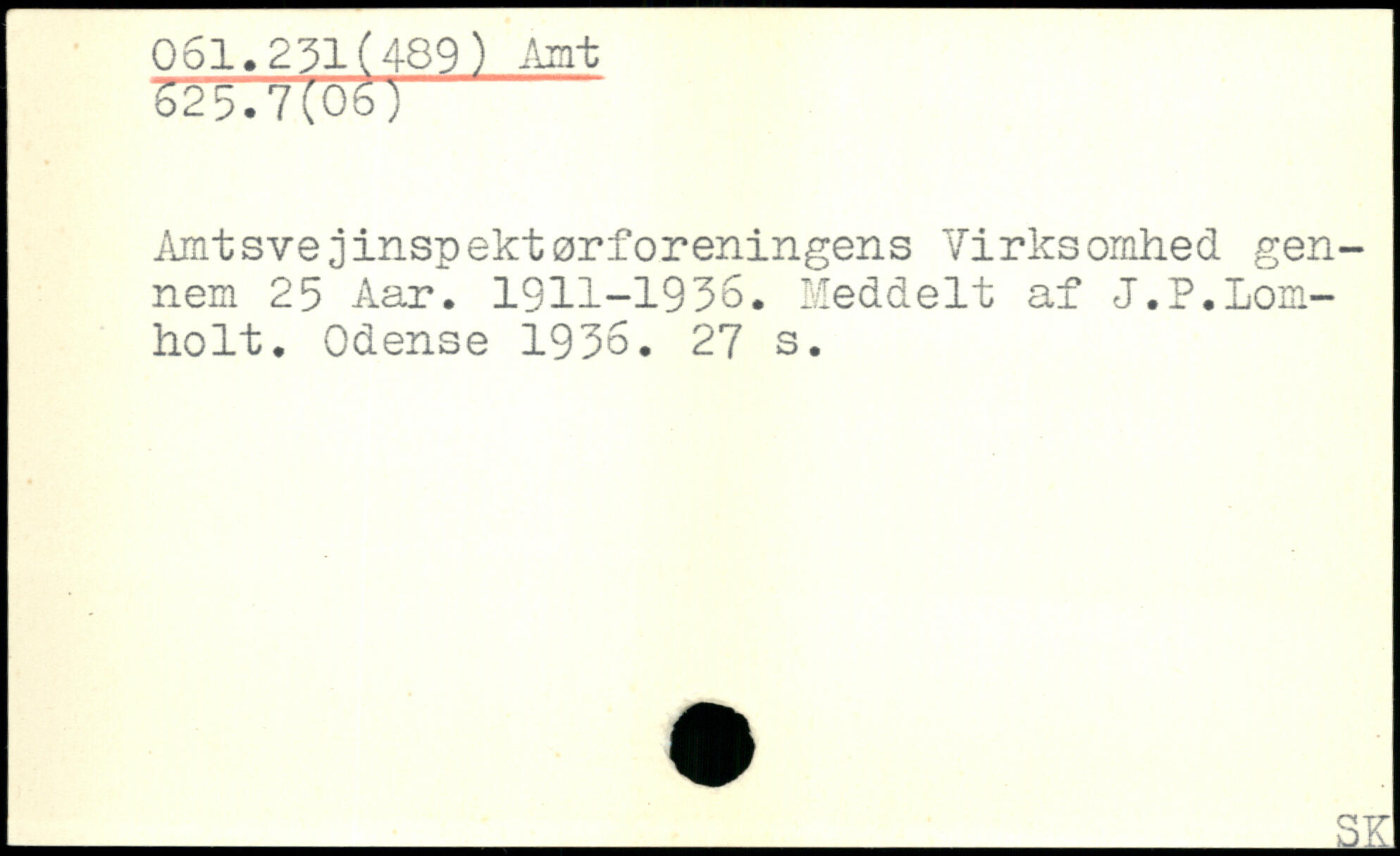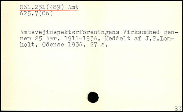 Amtsvejinspektørforeningens Virksomhed gennem 25 Aar. 1911-1936. Meddelt af J.P.Lom-holt. Odense 1936.