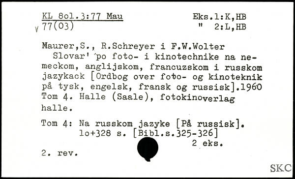 Slovar’ 'po foto- i kinotechnike na ne-meckom, anglijskom, francuzskom i russkom jazykack [Ordbog over foto- og kinoteknik på tysk, engelsk, fransk og russisk].1960 Tom 4. Halle (Saale), fotokinoverlag halle. Tom 4. Na russkom jazyke [På russisk], lo