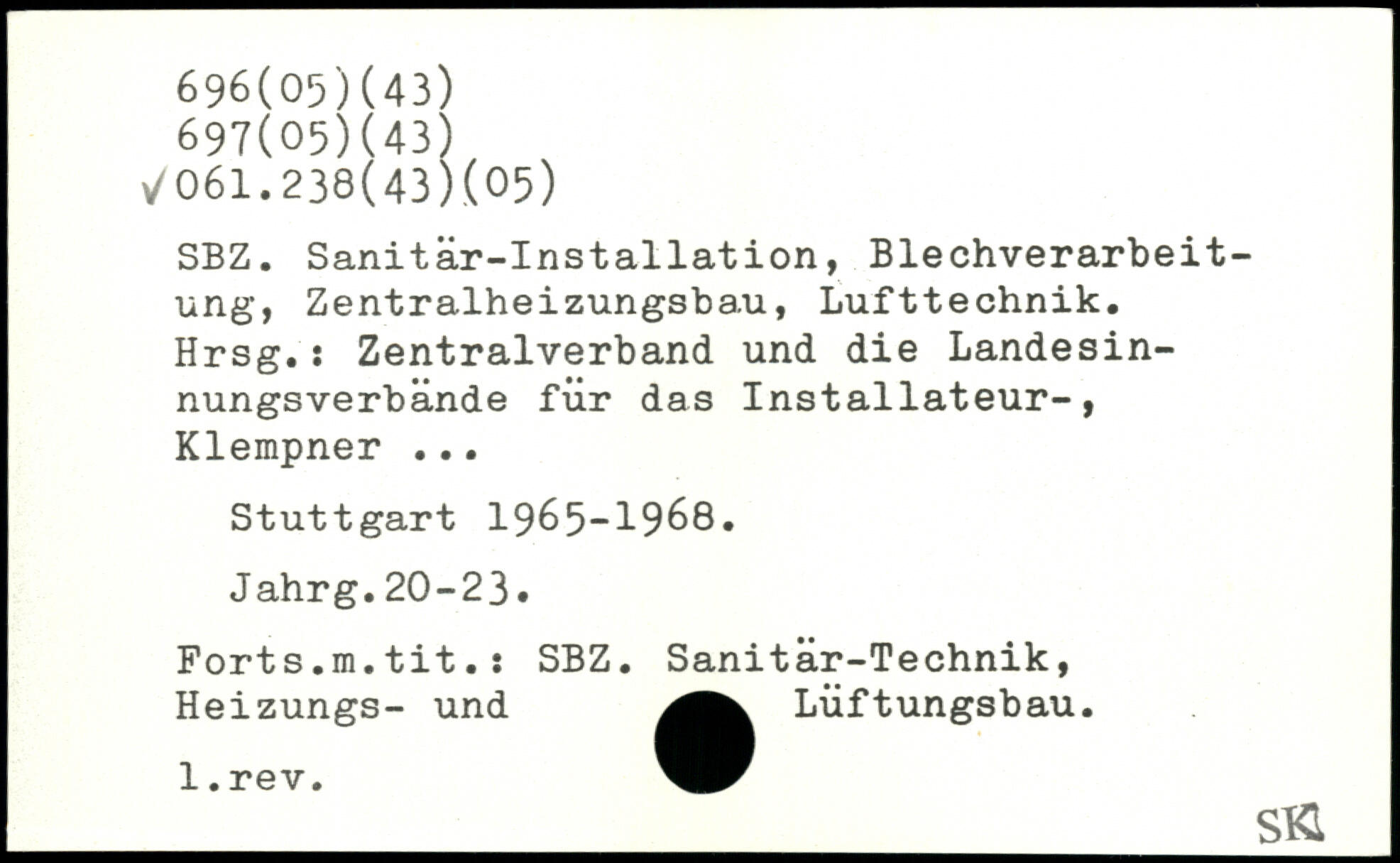 SBZ. Sanitâr-Installation, Blechverarbeit-ung, Zentralheizungsba.u, Lufttechnik. Hrsg.: Zentralverband und die Landesin-nungsverbande fur das Installateur-, Klempner ...