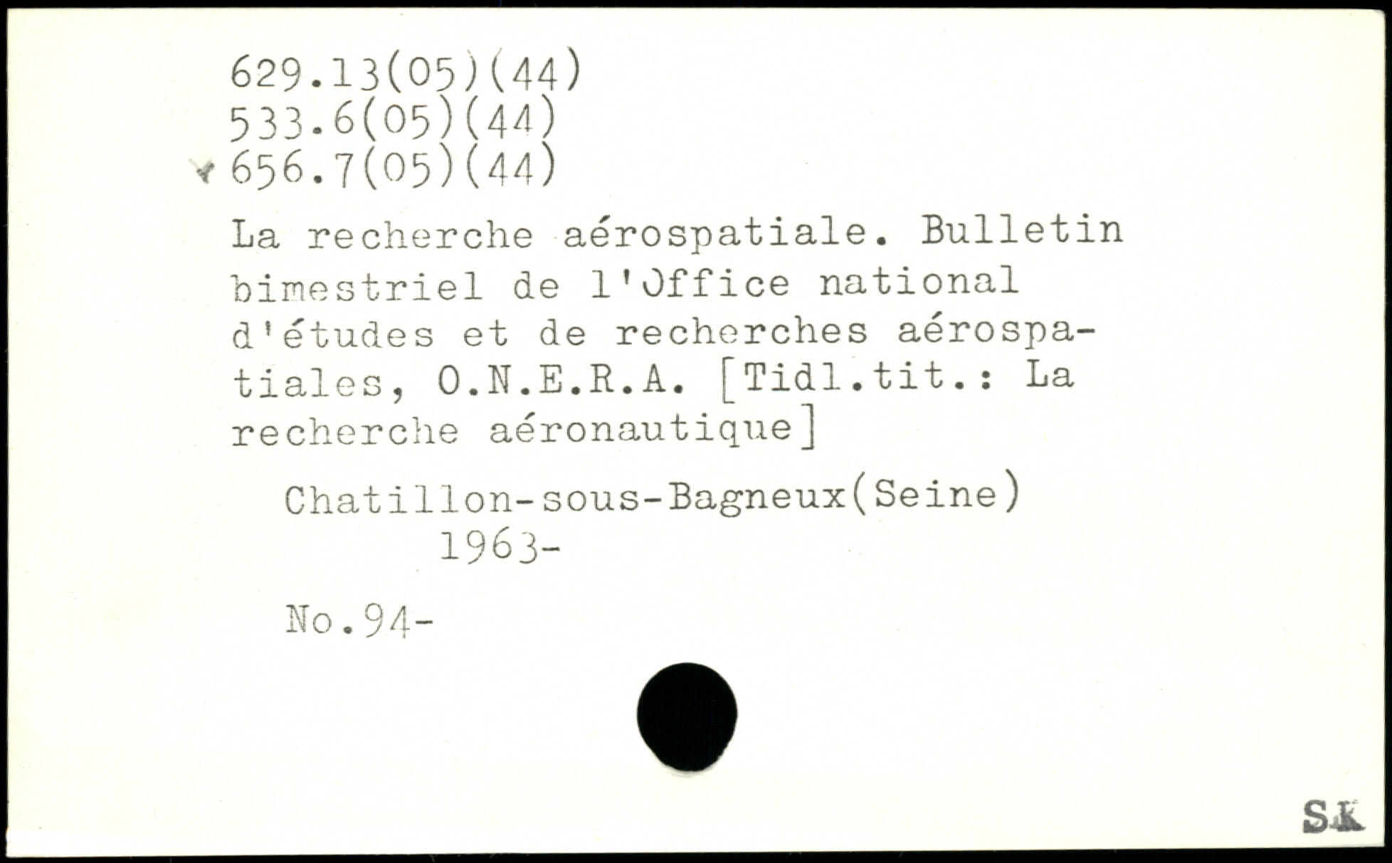 La recherche aérospatiale. Bulletin bimestriel de l’Office national d'études et de recherches aérospatiales, O.N.E.R.A. [Tidl.tit.: La recherche aéronautique] ChatilIon-sous-Bagneux(Seine) 1963- No.94- ___ÊLk