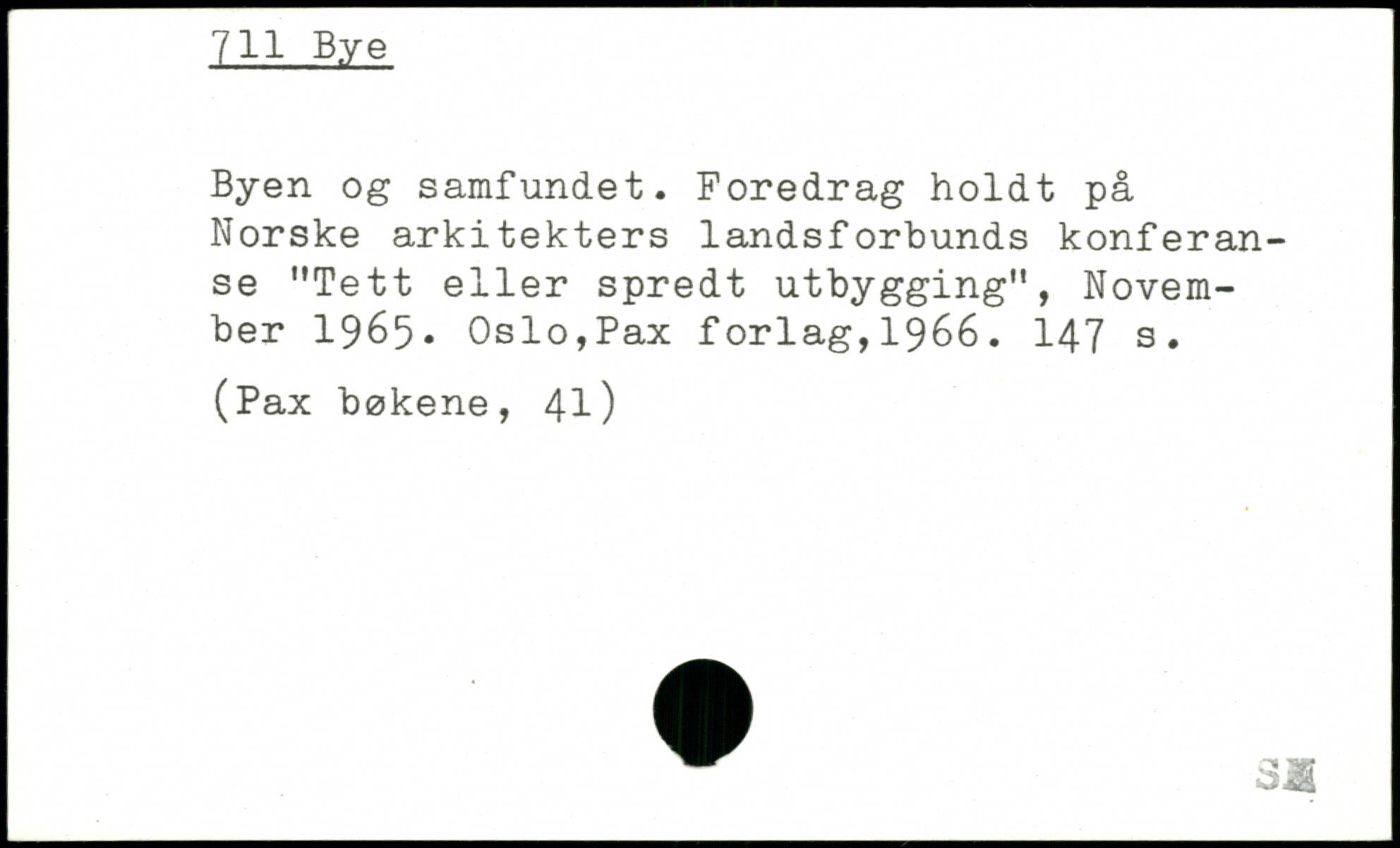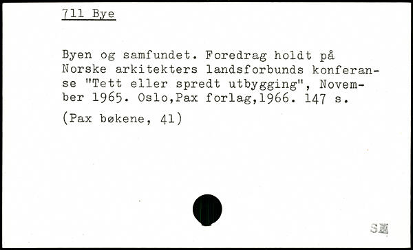 Byen og samfundet. Foredrag holdt på Norske arkitekters landsforbunds konferan-se "Tett eller spredt utbygging", November 1965