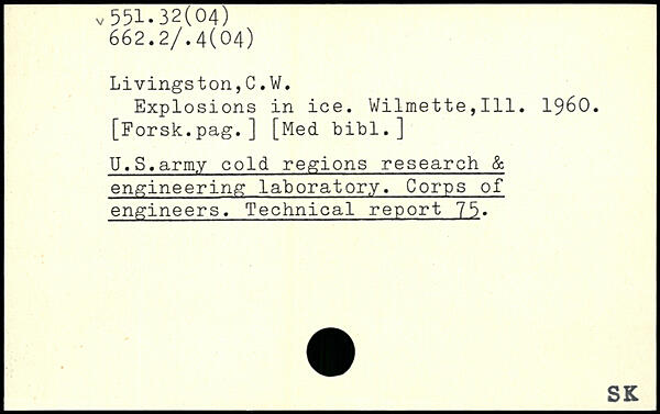 Explosions in ice. Wilmette,111. 1960. [Forsk.pag.] [Med bibl.] U.S.army cold regions research & engineering laboratory. Corps of engineers. Technical report 75