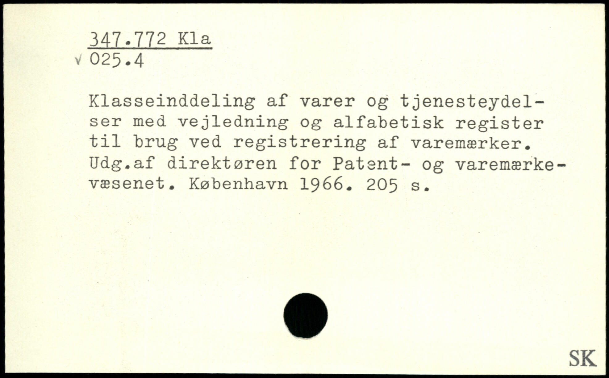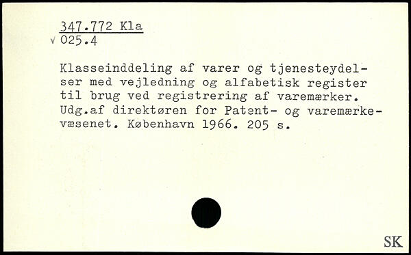 Klasseinddeling af varer og tjenesteydelser med vejledning og alfabetisk register til brug ved registrering af varemærker. Udg.af direktøren for Patent- og varemærkevæsenet.