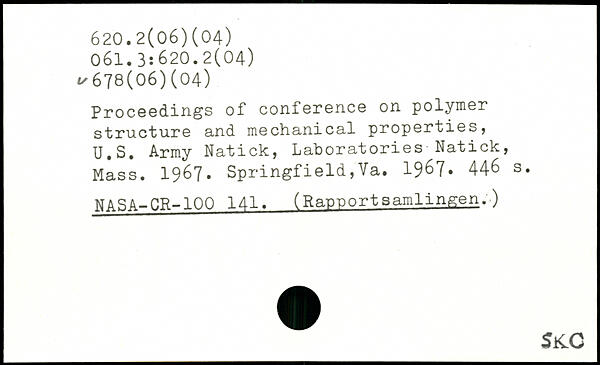 Proceedings of conference on polymer structure and mechanical properties, U.S. Army Natick, Laboratories Natick, Mass. 1967. Springfield,Va. 1967