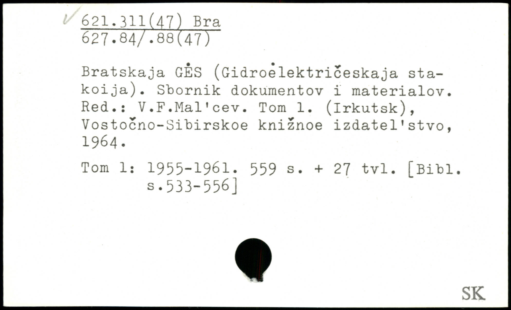Bratskaja GES (Gidroelektriceskaja sta-koija). Sbornik dokumentov i materialov. Red.: V.F.Mal'cev. Tom 1. (Irkutsk), Vostocno-Sibirskoe kniznoe izdatel'stvo, 1964. Tom 1: 1955-1961.