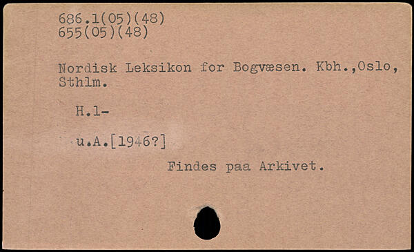 Nordisk Leksikon for Bogvæsen. Kbh.,0slo, S i: him. .u.A.[1946?] Findes paa Arkivet.