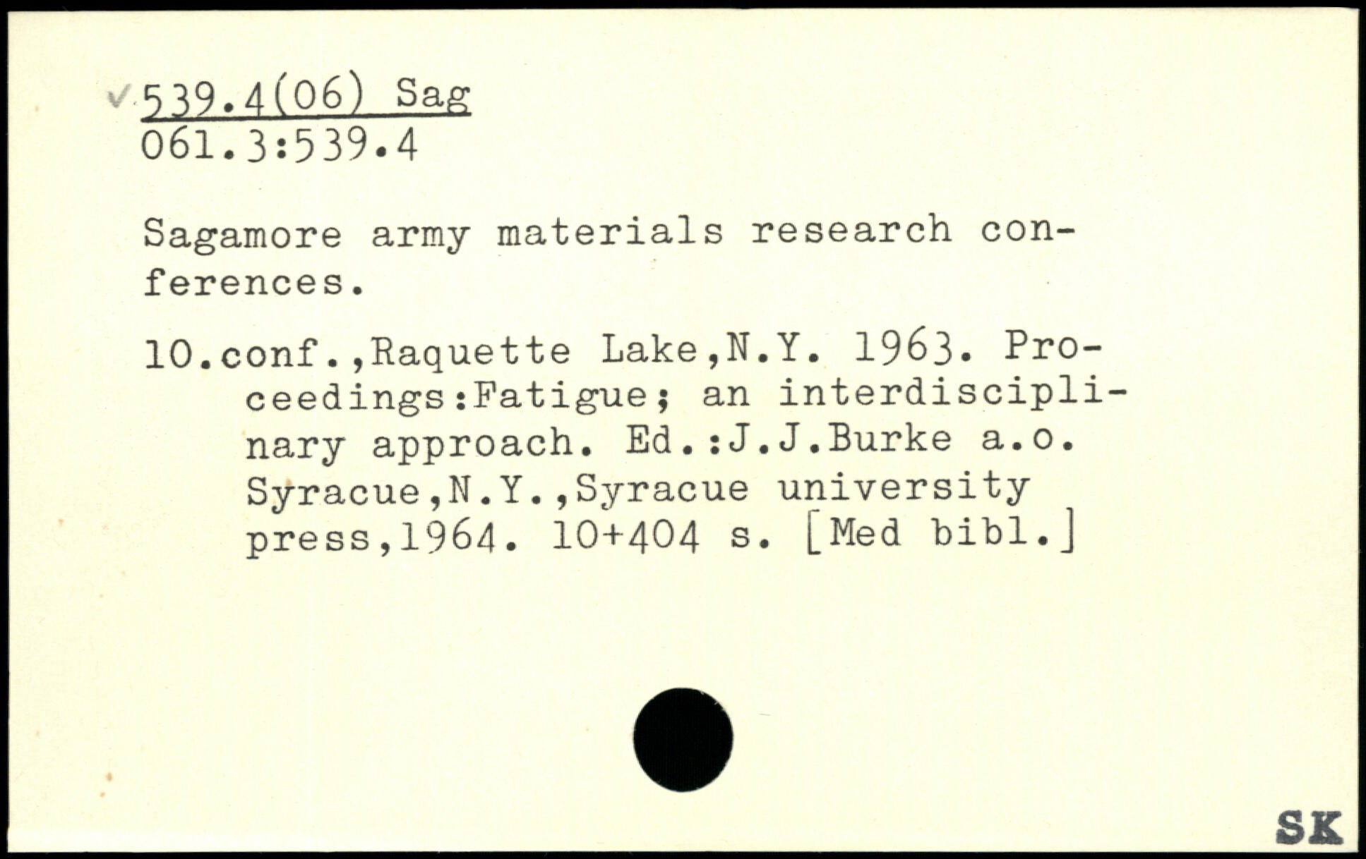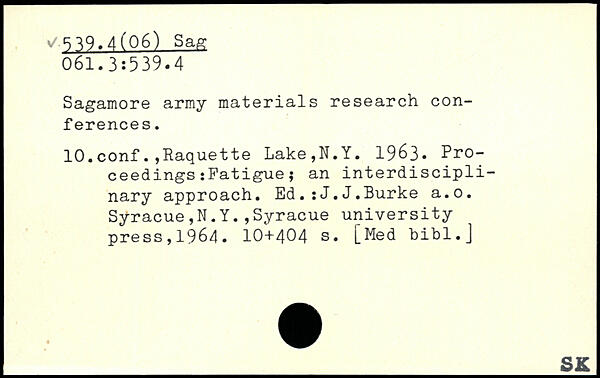 Sagamore army materials research conference s. lO.conf.,Raquette Lake,N.Y. 1963- Proceedings :Fatigue; an interdisciplinary approach. Ed.:J.J.Burke a.o.