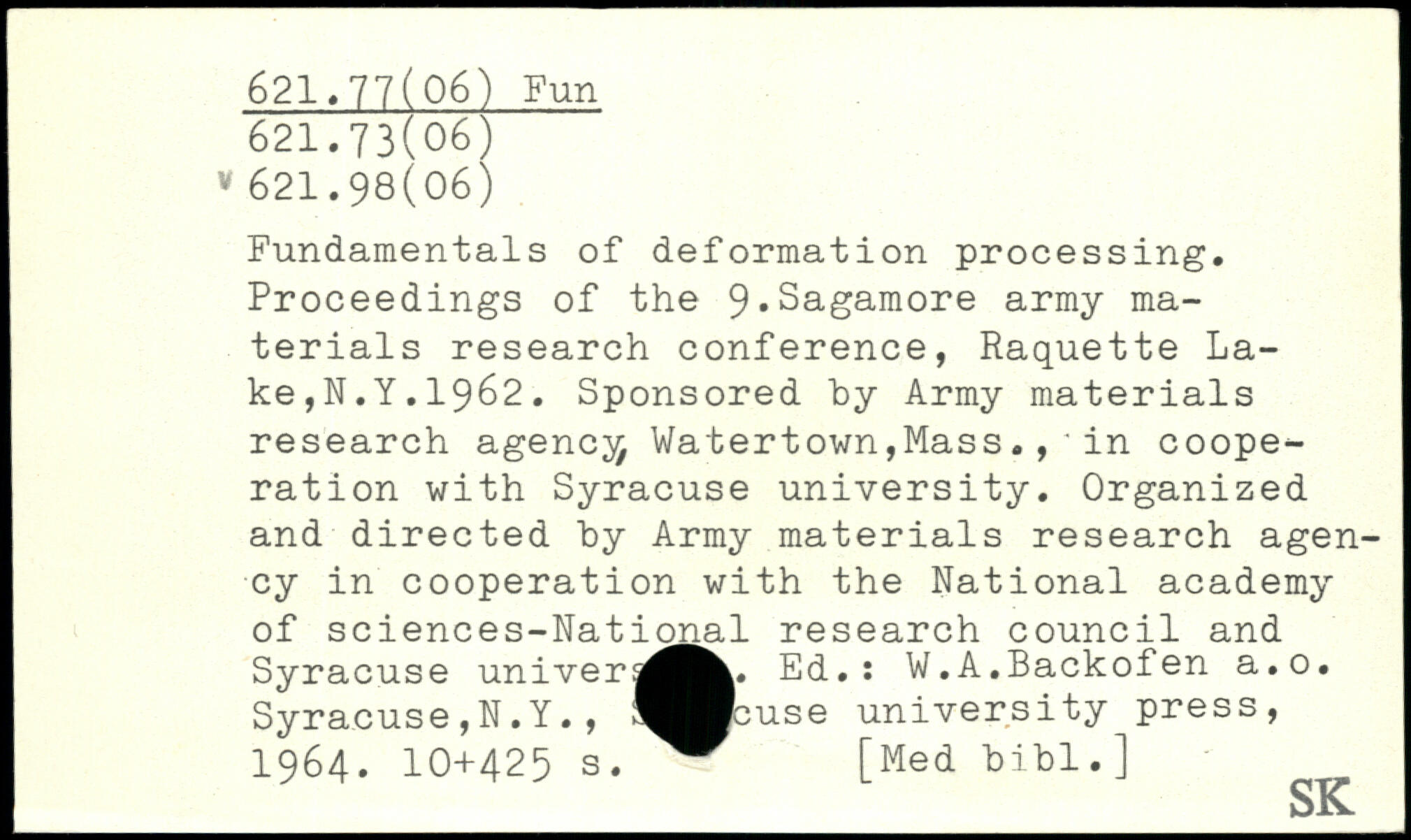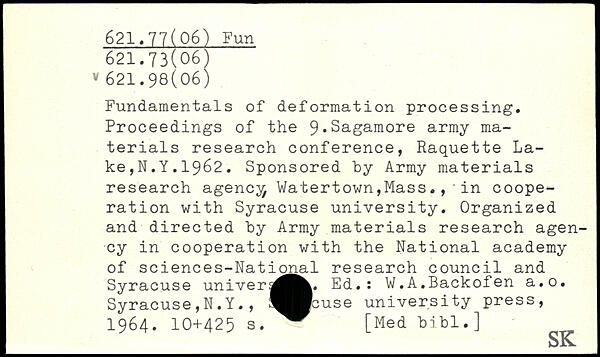 Fundamentals of deformation processing. Proceedings of the 9"Sagamore army materials research conference, Raquette Lake, N.Y.1962. Sponsored by Army materials I research agency Watertown,Mass.,. in coope ration with Syracuse university. Organized and directed by Army materials research agency in cooperation with the National academy of sciences-National research council and Syracuse univer|^^^. Ed.: W.A.Backofen a.o. Syracuse,N.Y. , use university press, 1964.