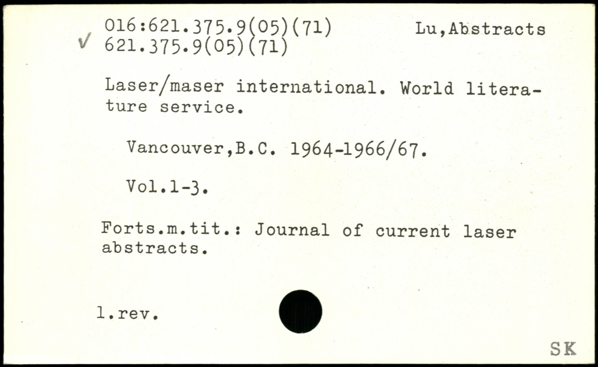 Laser/maser international. World literature service. Vancouver,B.C. 1964-1966/67.