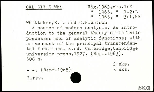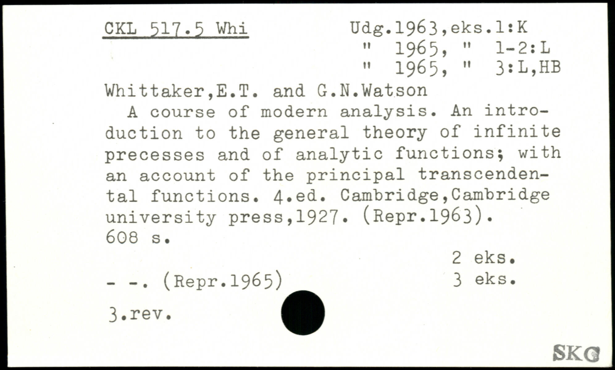 " 1965, " 1-2:L " 1965, " 3:L,HB Whittaker,E.T. and G.N.Watson A course of modern analysis. An introduction to the general theory of infinite precesses and of analytic functions; with an account of the principal transcendental functions. 4,ecL.
