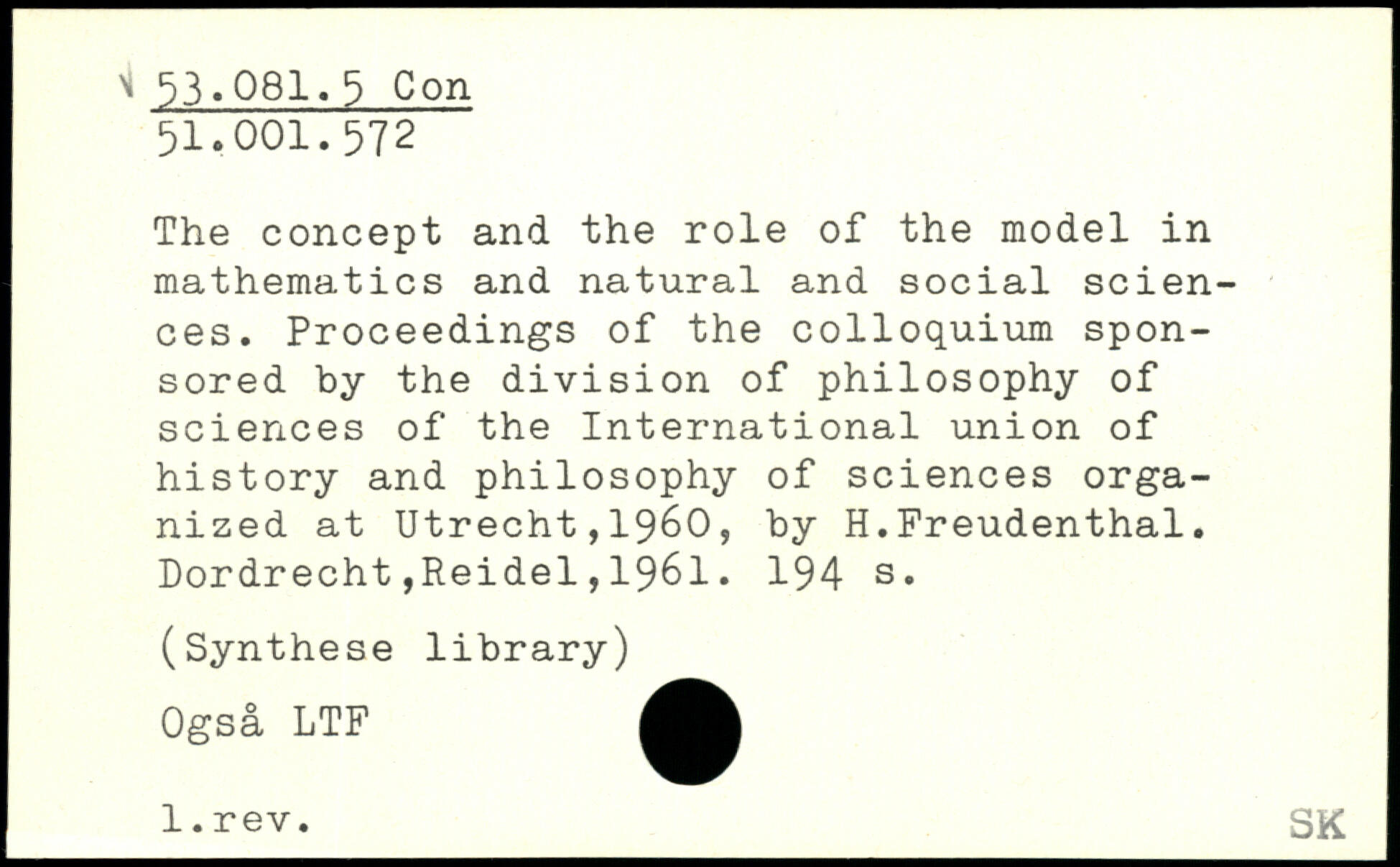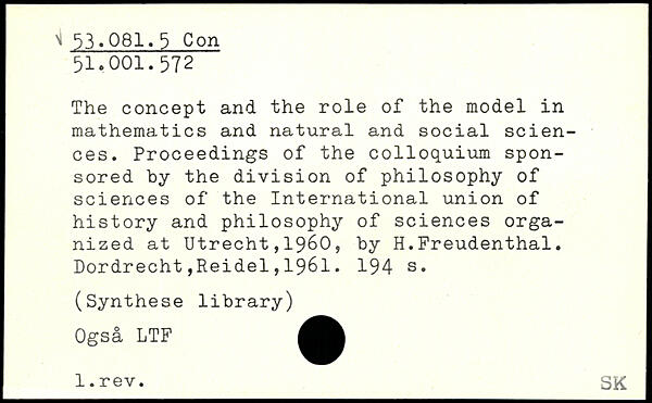 The concept and the role of the model in mathematics and natural and social sciences. Proceedings of the colloquium sponsored by the division of philosophy of sciences of the International union of history and philosophy of sciences organized at Utrecht,1960, by H.Freudenthal.
