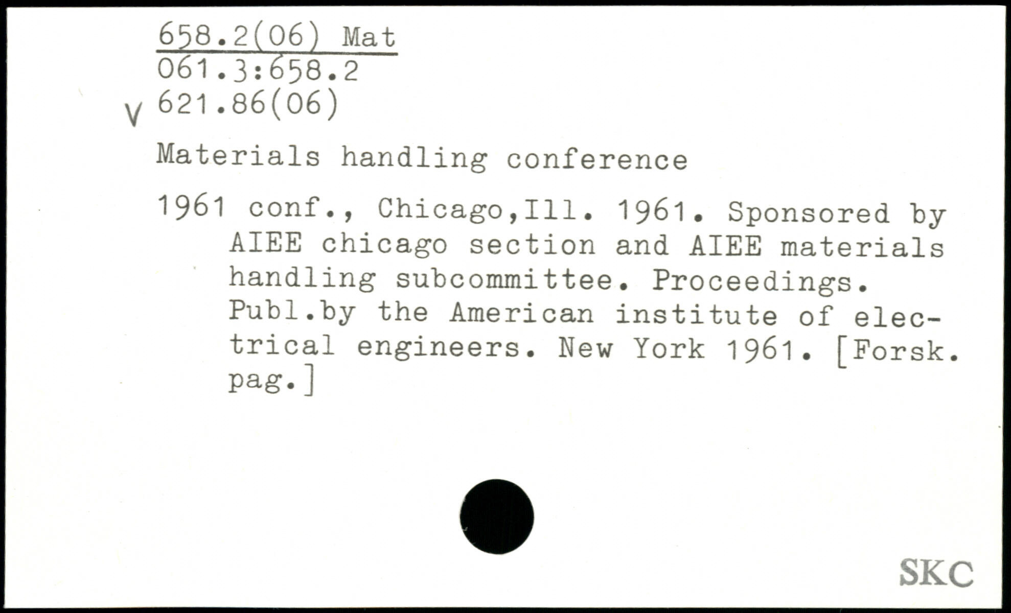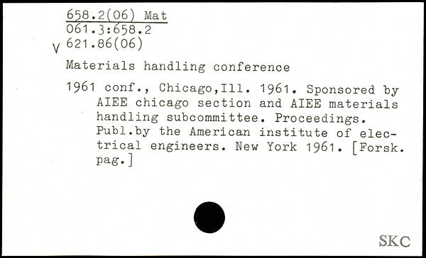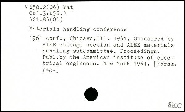Materials handling conference 1961 conf., Chicago,111. 1961. Sponsored by AIEE Chicago section and AIEE materials handling subcommittee. Proceedings.