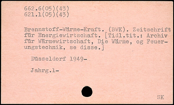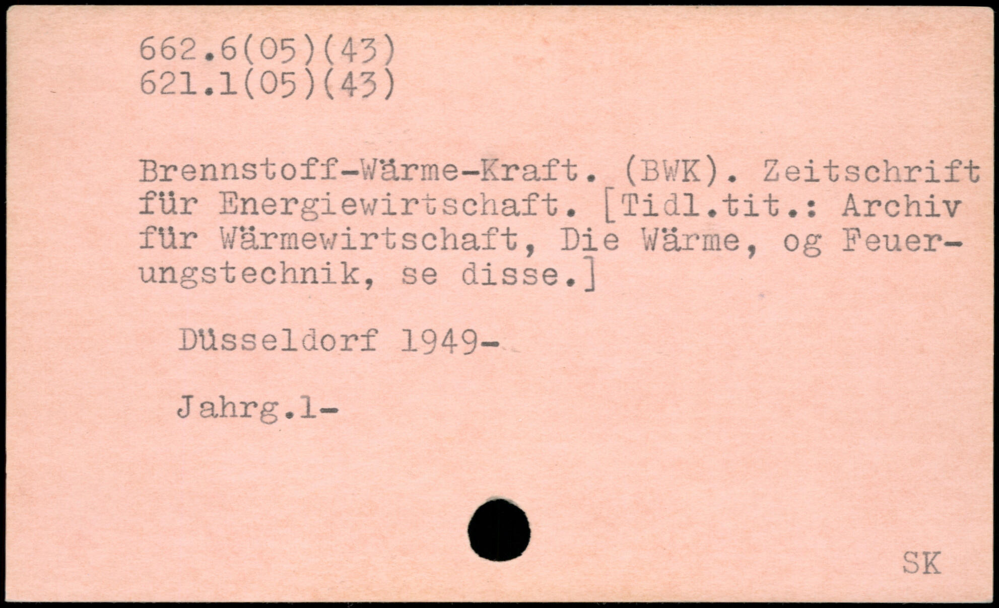 Brennstoff-Wärme-Kraft. (BWK). Zeitschrift für Energiewirtschaft. [Tidl.tit.: Archiv für Wärmewirtschaft, Die Wärme, og Feuer-ungstechnik, se disse.j Düsseldorf 1949- J ahrg.l-