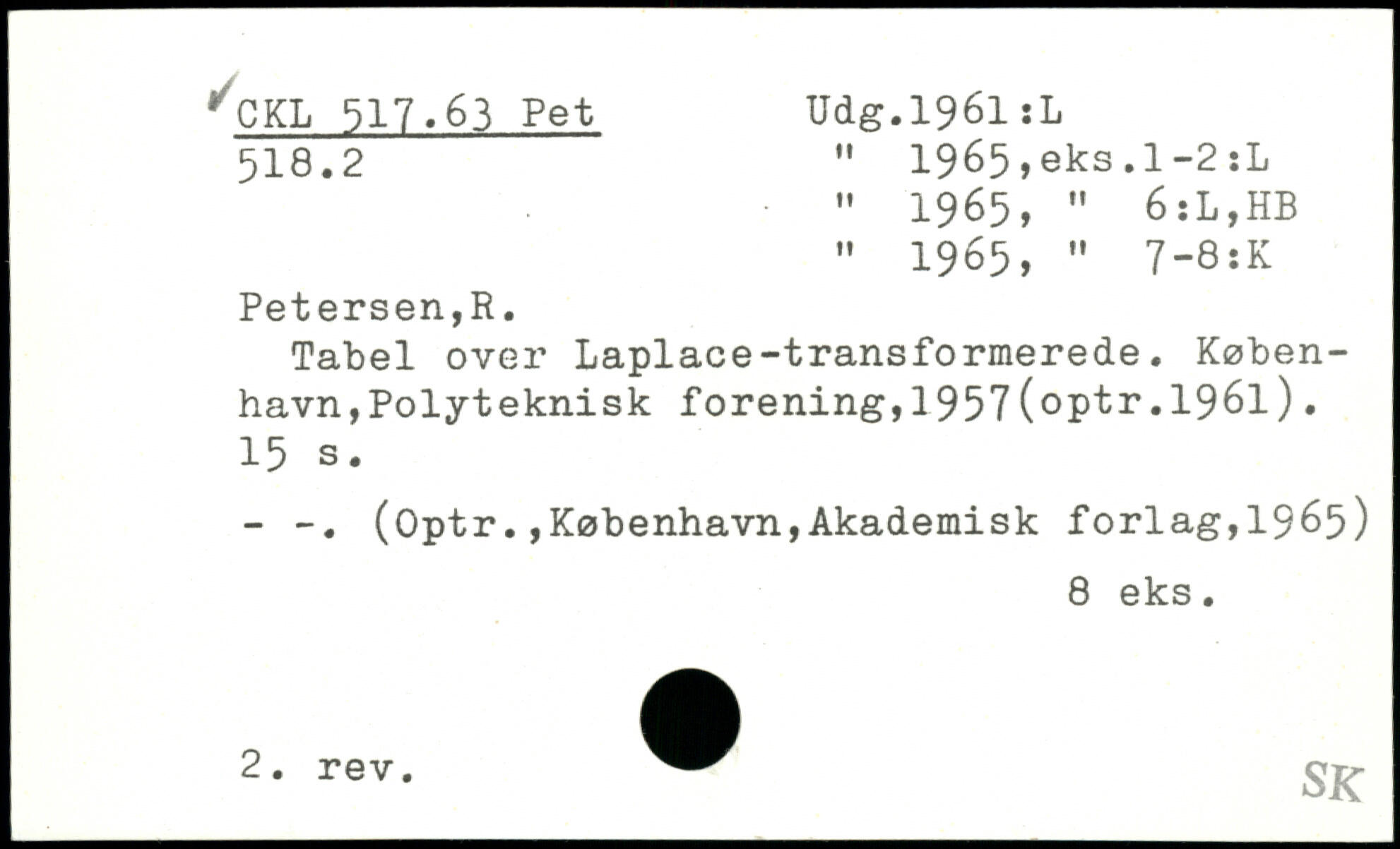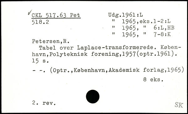 " 1965, " 6:L,HB " 1965, " 7-8:K Petersen,R. Tabel over Laplace-transformerede.