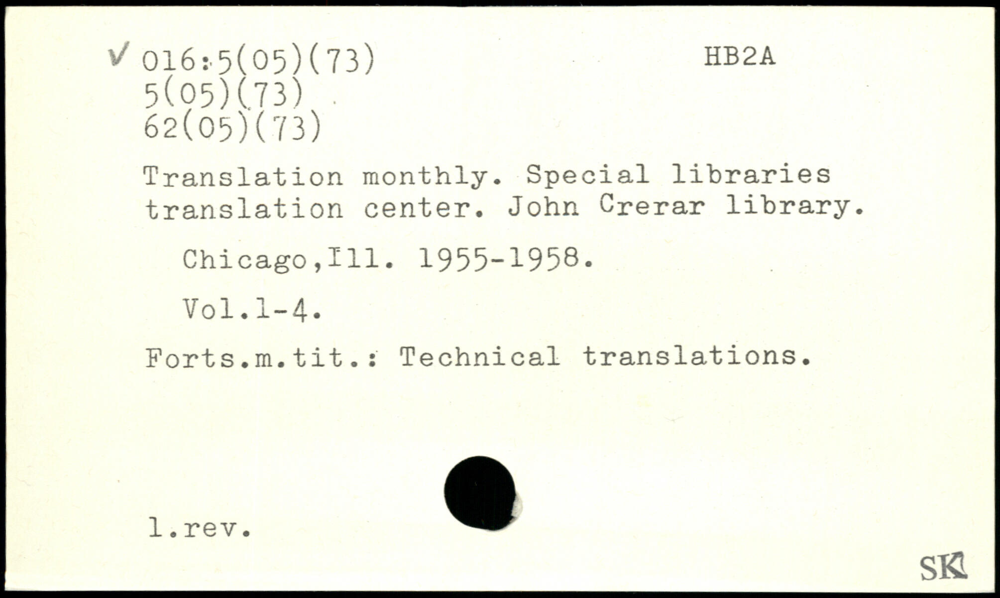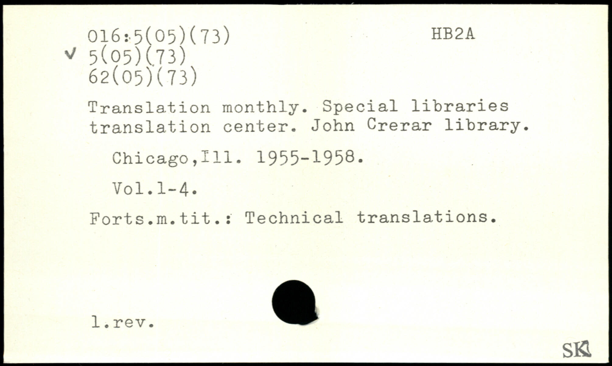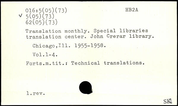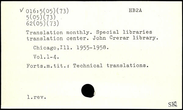 Translation monthly. Special libraries translation center. John Crerar library. Chicago,111. 1955-1958.