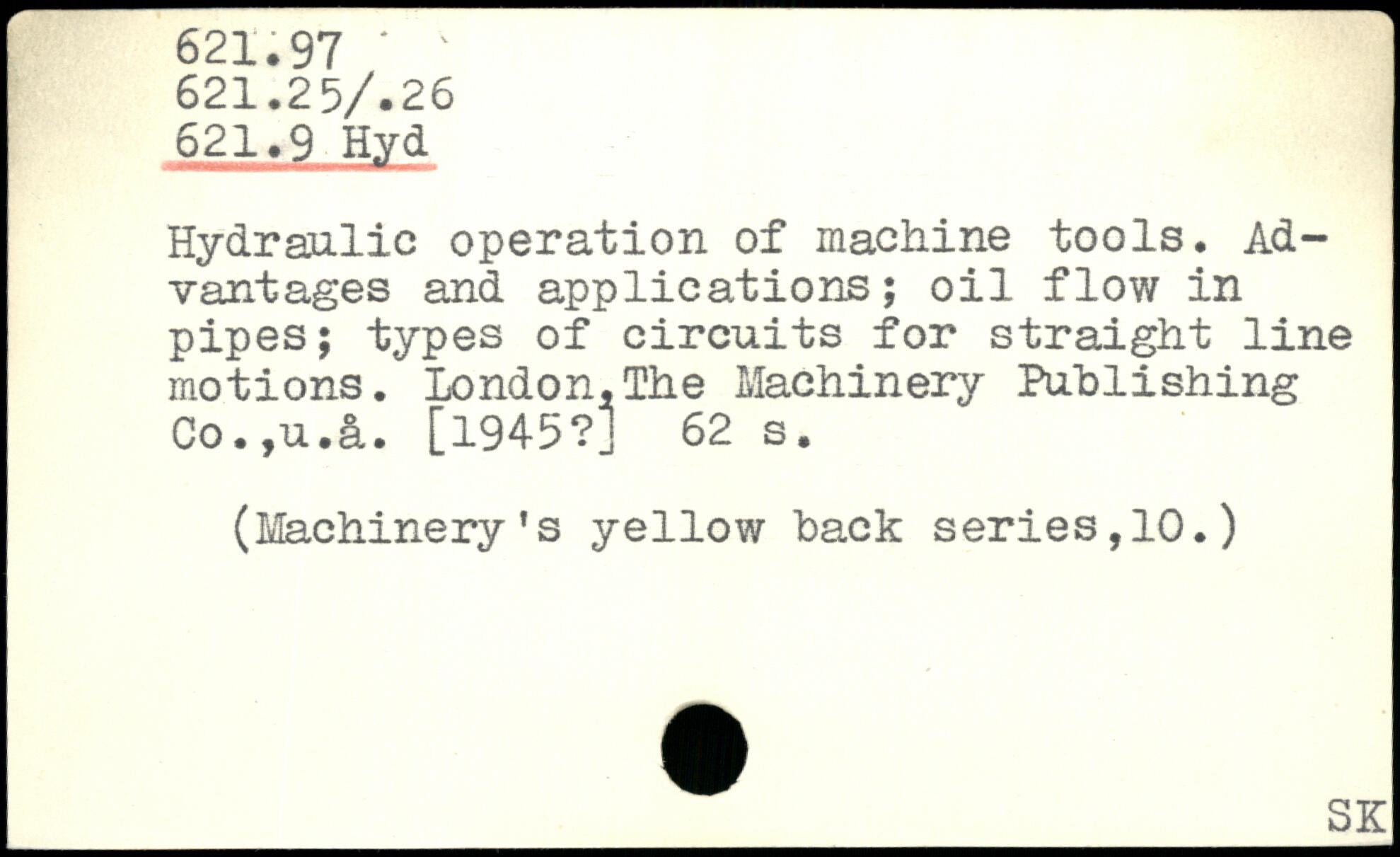 Hydraulic operation of machine tools. Advantages and applications; oil flow in pipes; types of circuits for straight line motions. London,The Machinery Publishing Co. ,u.§.. [1945?]