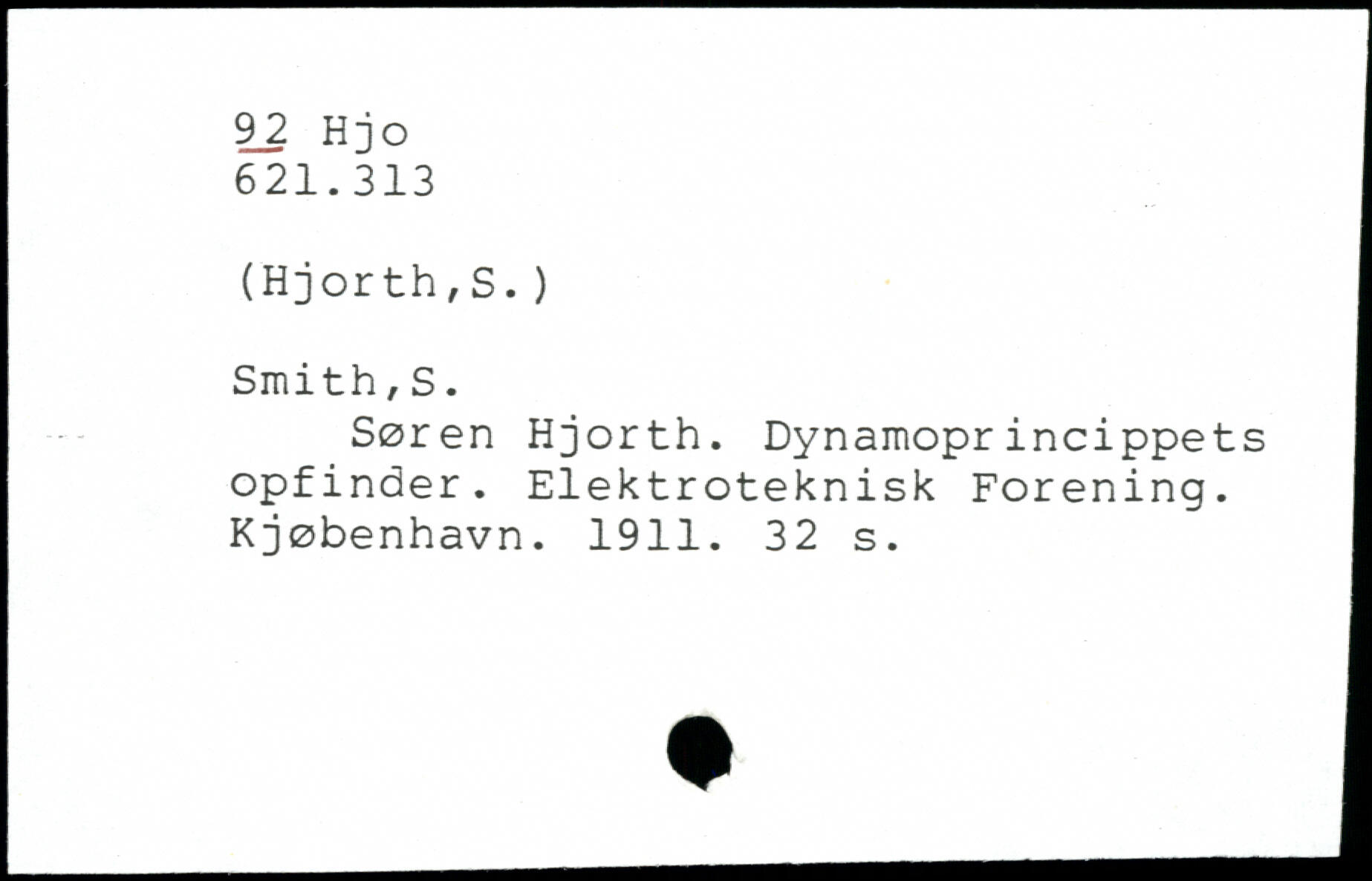 Søren Hjorth. Dynamoprincippets opfinder. Elektroteknisk Forening. j Kjøbenhavn. 1911.