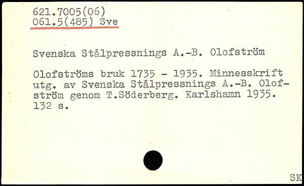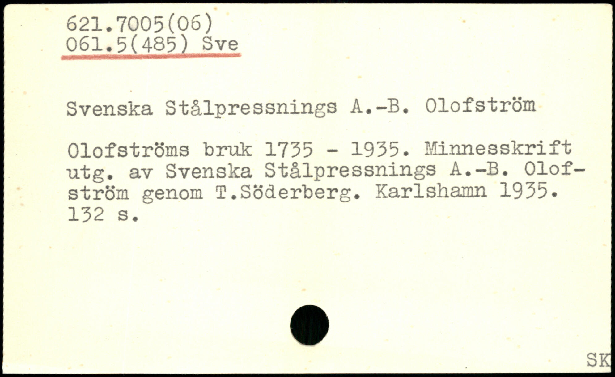 Svenska Stålpressnings A.-B. Olofström Olofströms bruk 1735 - 1935. Minnesskrift utg. av Svenska Stålpressnings A.-B. Olofström genom T.Söderberg. Karlshamn 1935.