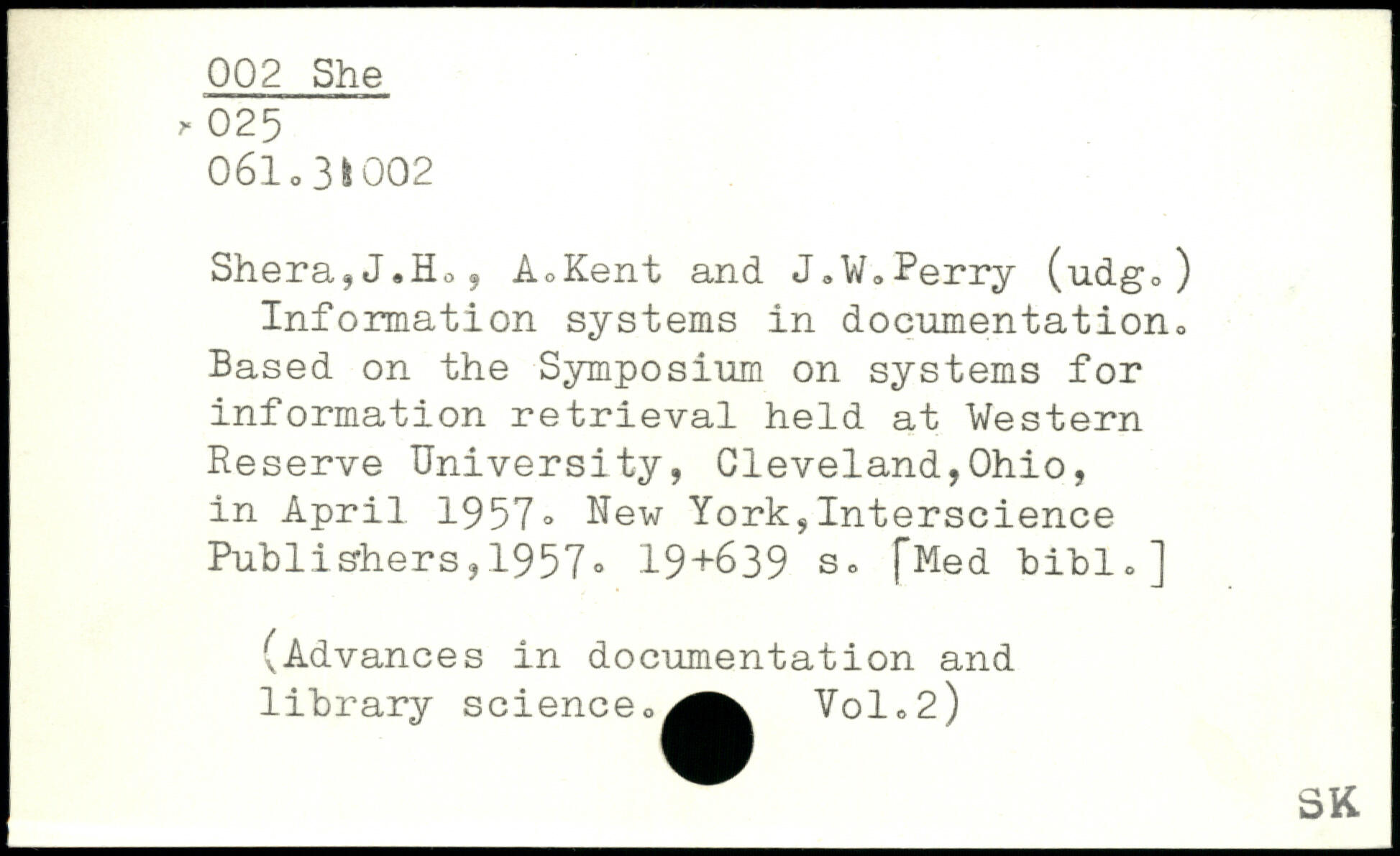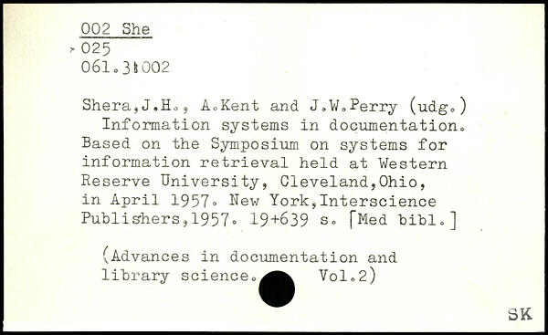 Shera,J.Ho, A,Kent and J,W,Perry (udgo) Information systems in documentation. Based on the Symposium on systems for information retrieval held at Western Reserve University, Cleveland,Ohio, in April 1957.