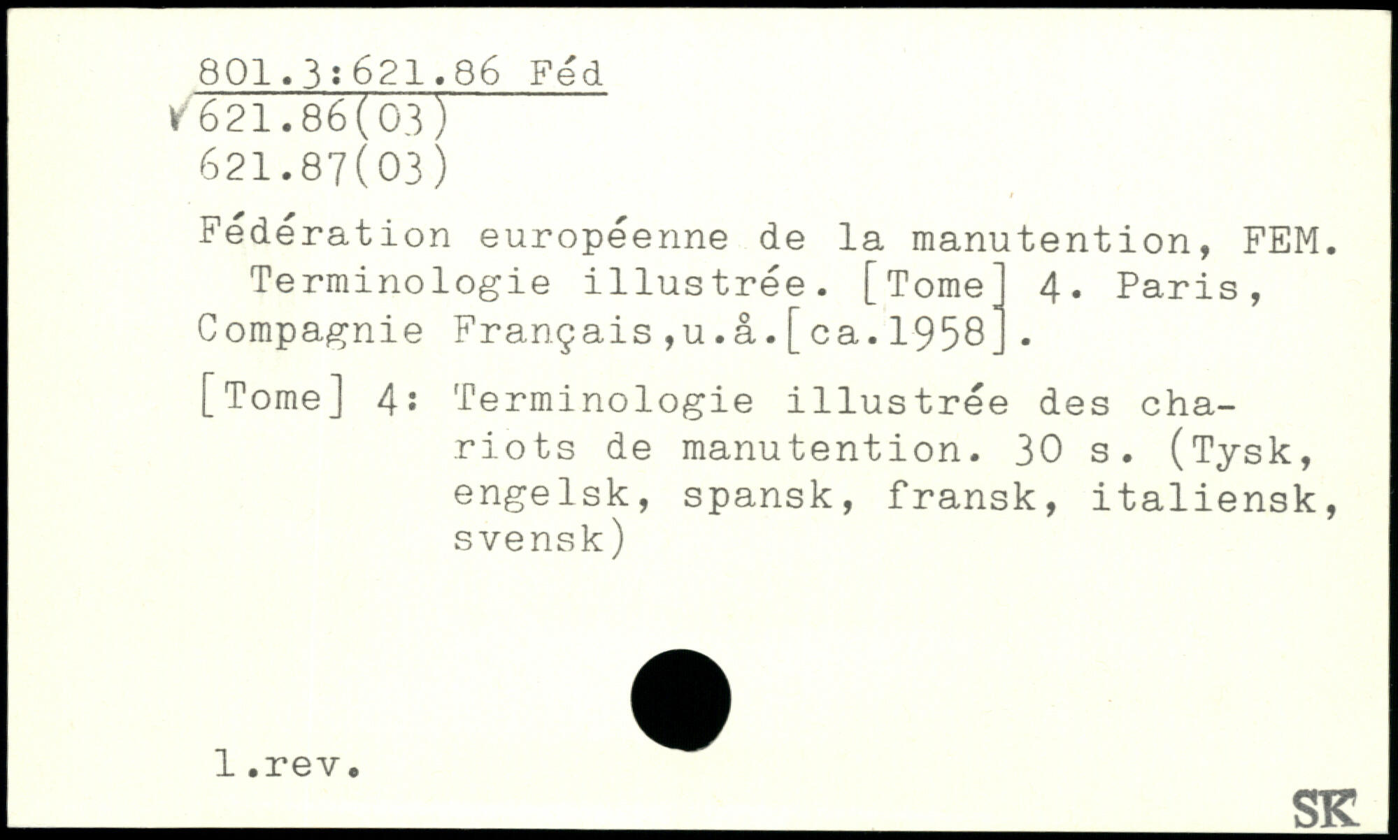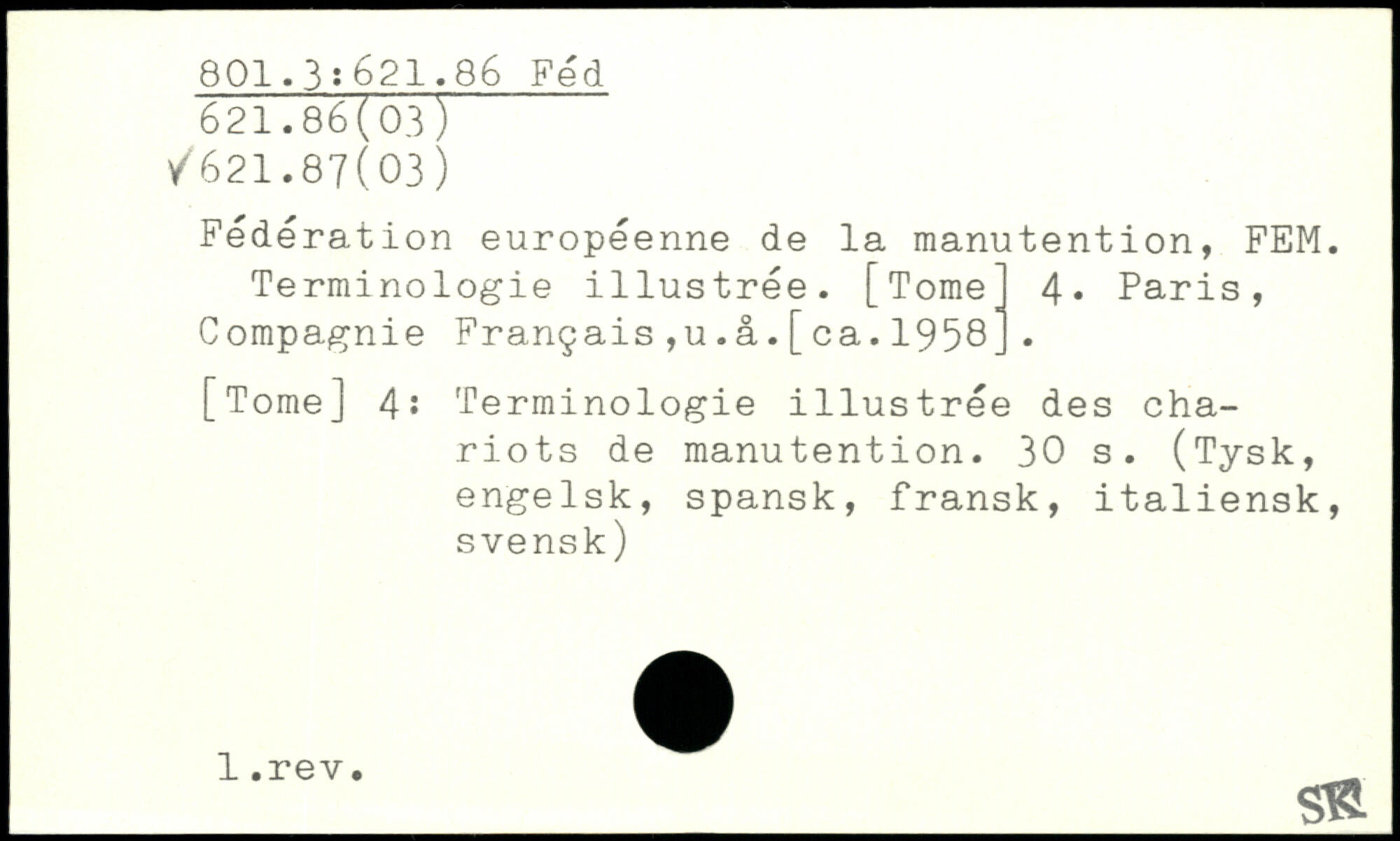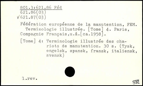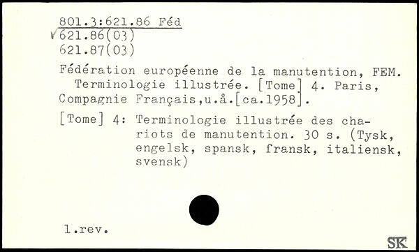 Fédération européenne de la manutention, FEM. Terminologie illustrée. [Tome] 4. Paris, Compagnie Français,u.â.[ca.1958.