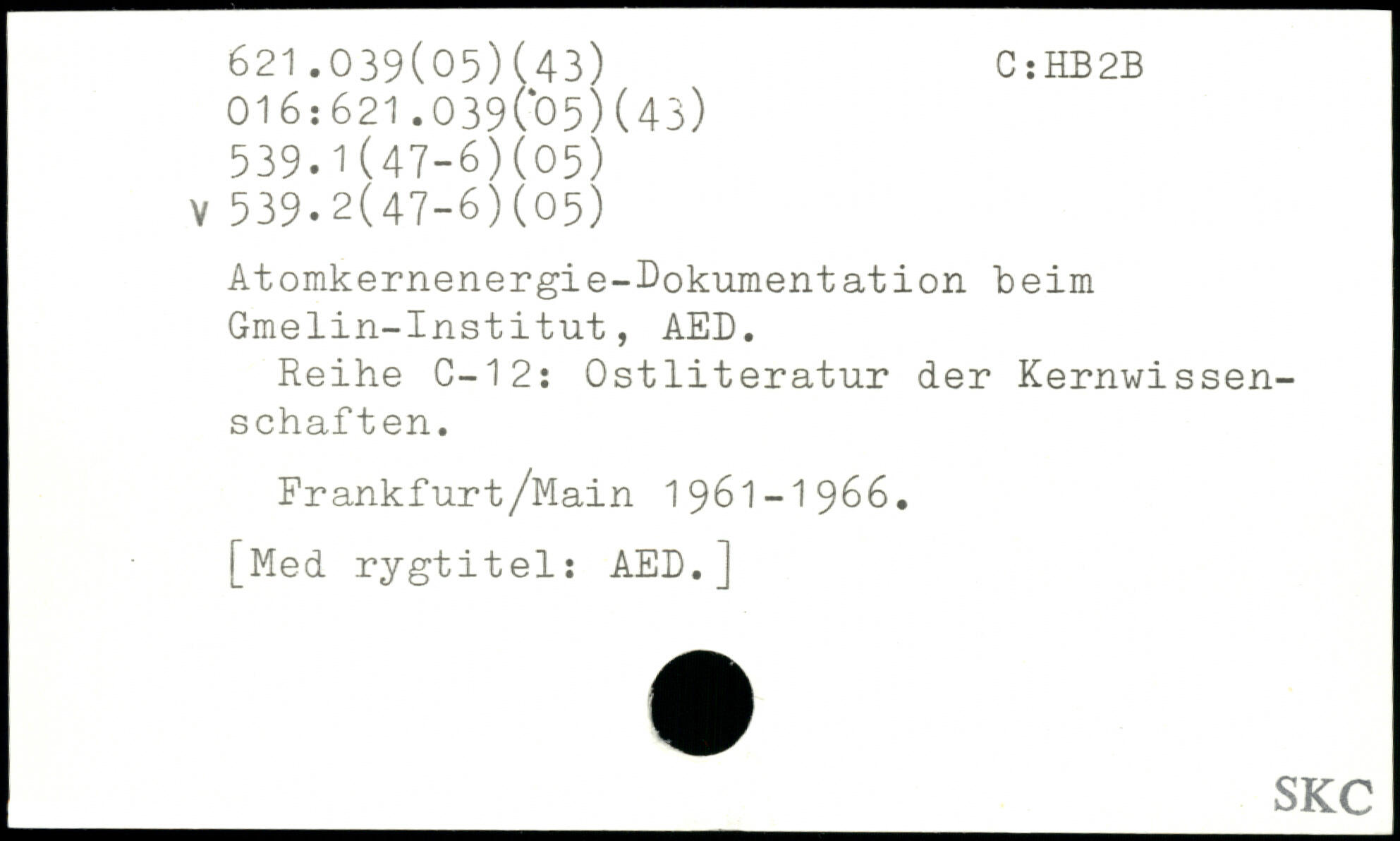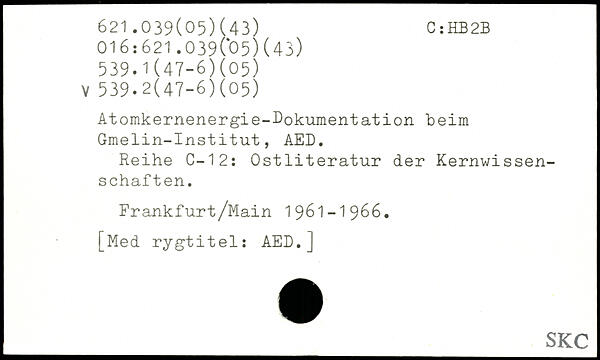 Atomkernenergie-Dokumentation beim Gmelin-Institut, AED. Reihe C—12: Ostliteratur der Kernwissenschaf ten. Frankfurt/Main 1961-1966.