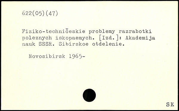 Fiziko-techniceskie problemy razrabotki poleznych iskopaemych. [izd.]: Akademija nauk SSSR. Sibirskoe otdelenie. Novosibirsk 1965“