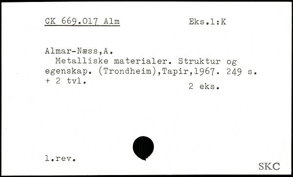 Metalliske materialer. Struktur og egenskap. (Trondheim),Tapir,1967.