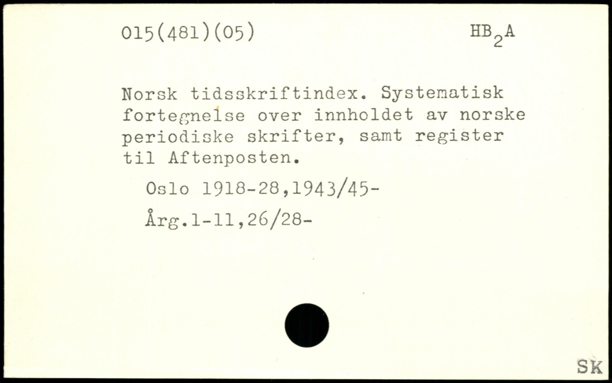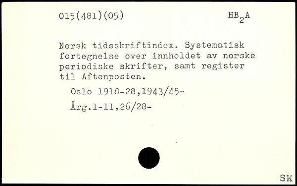 Norsk tidsskriftindex. Systematisk fortegnelse over innholdet av norske periodiske skrifter, samt register til Aftenposten. Oslo 1918-28,1943/45-Årg.1-11,26/28-