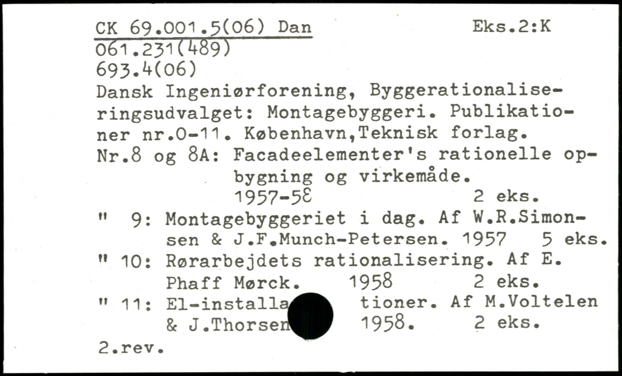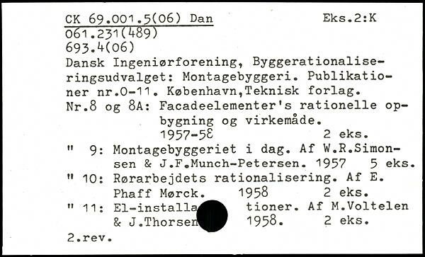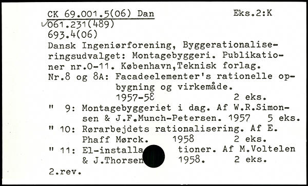 Dansk Ingeniørforening, Byggerationaliseringsudvalget: Montagebyggeri. Publikationer nr.0-11. København,Teknisk forlag. Nr.8 og 8A: Facadeelementer’s rationelle opbygning og virkemåde. 1957-58 2 eks. " 9: Montagebyggeriet i dag. Af W.R.Simonsen & J.F.Munch-Petersen. 1957 5 eks. " 10: Rørarbejdets rationalisering. Af E. Phaff Mørck. 1958 2 eks. " 11; El-installa^^k tioner. Af M.Voltelen & J.Thorser^^ 1958. 2 eks.