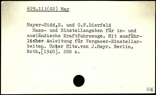 Mayer-Sidd,E. und G.F,Dierfeld Hass- und Einstellangahen für in- und ausländische Kraftfahrzeuge, Mit ausführlicher .Anleitung für Vergaser-Einstellar-heiten. Unter Mitw,von J.Mayr.