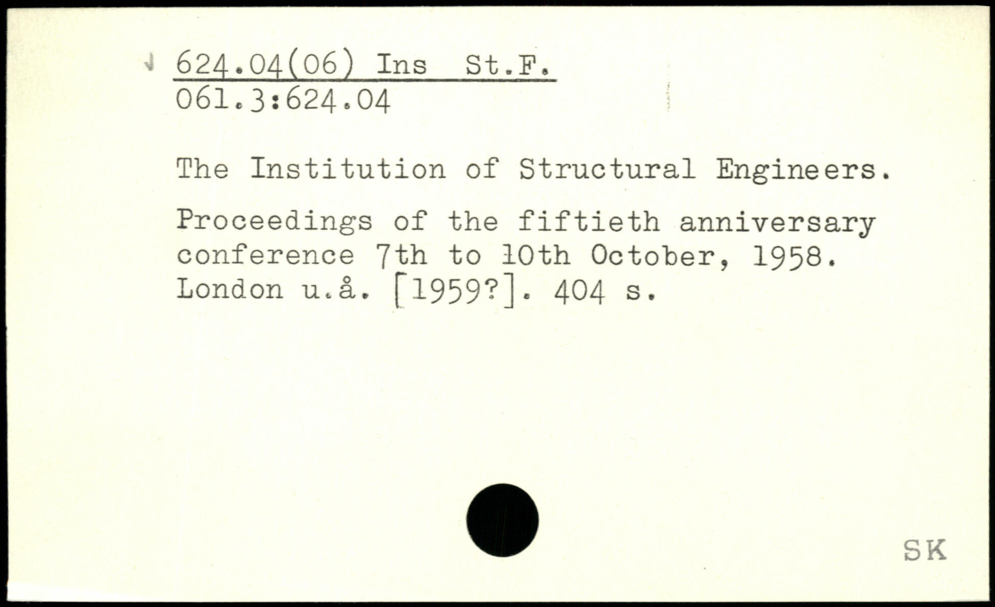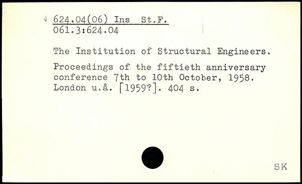 The Institution of Structural Engineers. Proceedings of the fiftieth anniversary conference 7th to 10th October, 1958. London u.a. [1959?].