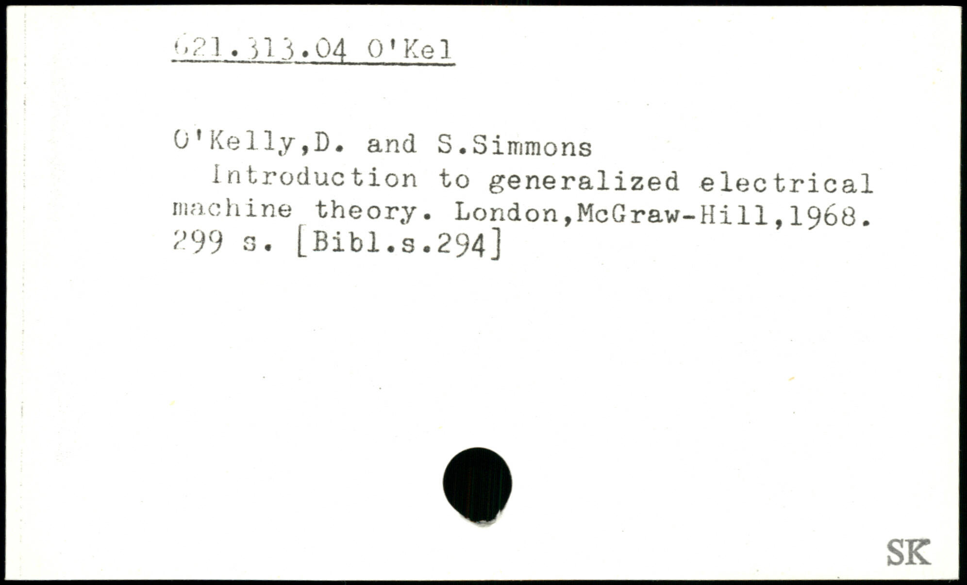 <■21. il i.C>4 0 1 Ke3 0'Kelly,D. and S. Simmons Introduction to generalized electrical machine theory.