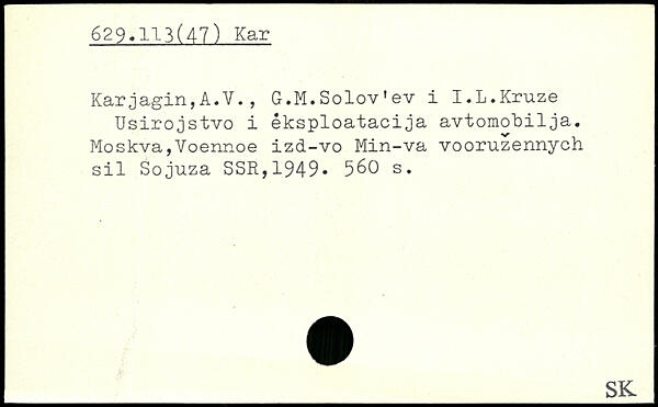 Karjagin,A.V., G.M.Solov'ev i I.L.Kruze Usirojstvo i éksploatacija avtomokilja. Moskva,Voennoe izd-vo Min-va vooruzennych sil Sojuza SSR,1949.