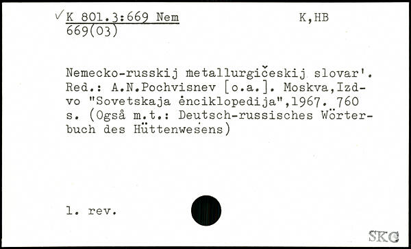 Nemecko-russkij iüetallurgiceski j slovar’. Red.: A.N.Pochvisnev [o.a.]. Moskva,Izd-vo "Sovetskaja enciklopedija”,1967. 7^