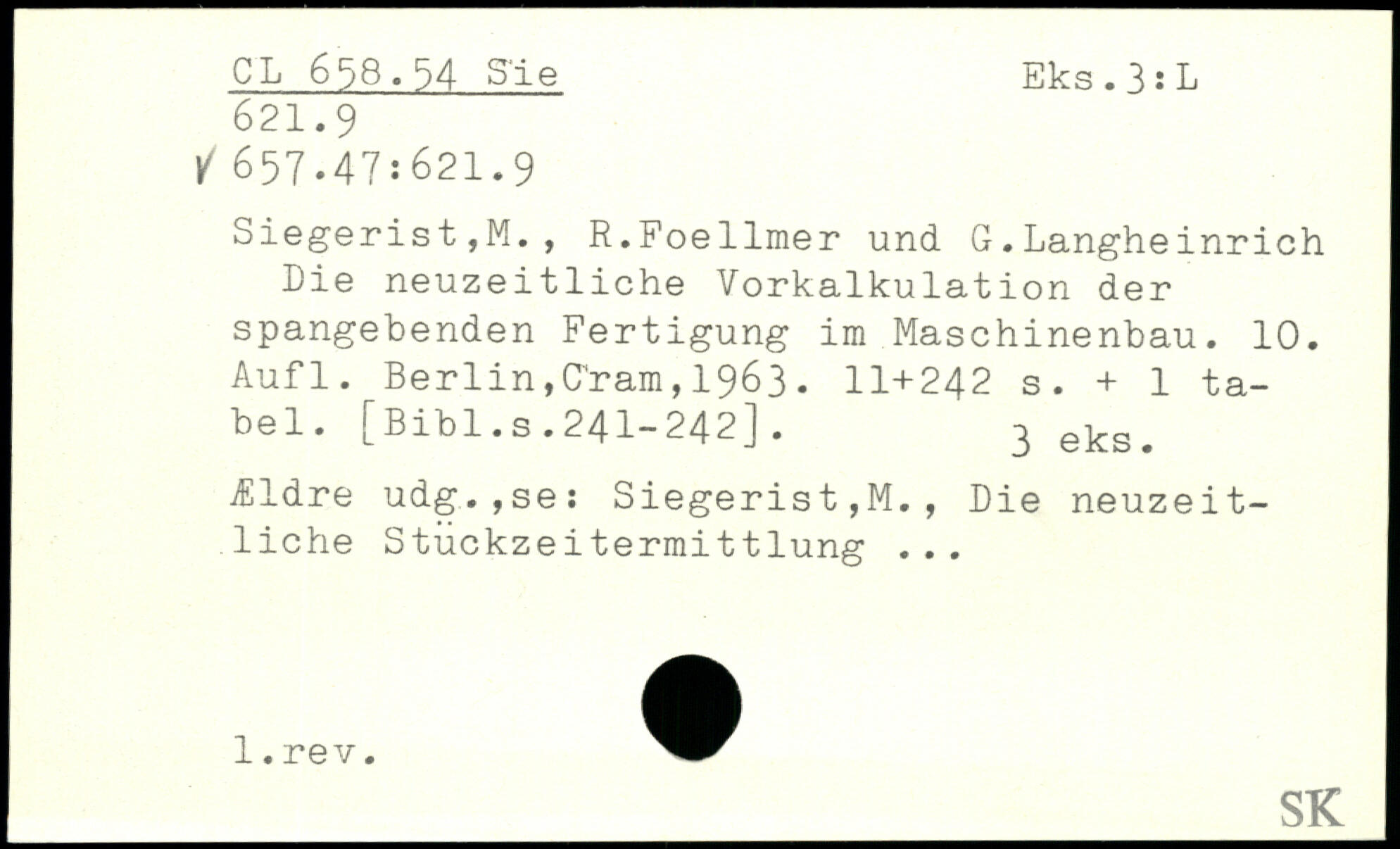 Siegerist,M., R.Foellmer und G.Langheinrich Die neuzeitliche Vorkalkulation der spangebenden Fertigung im Maschinenbau. 10. Auf 1. Berlin,C’ram, 1963.