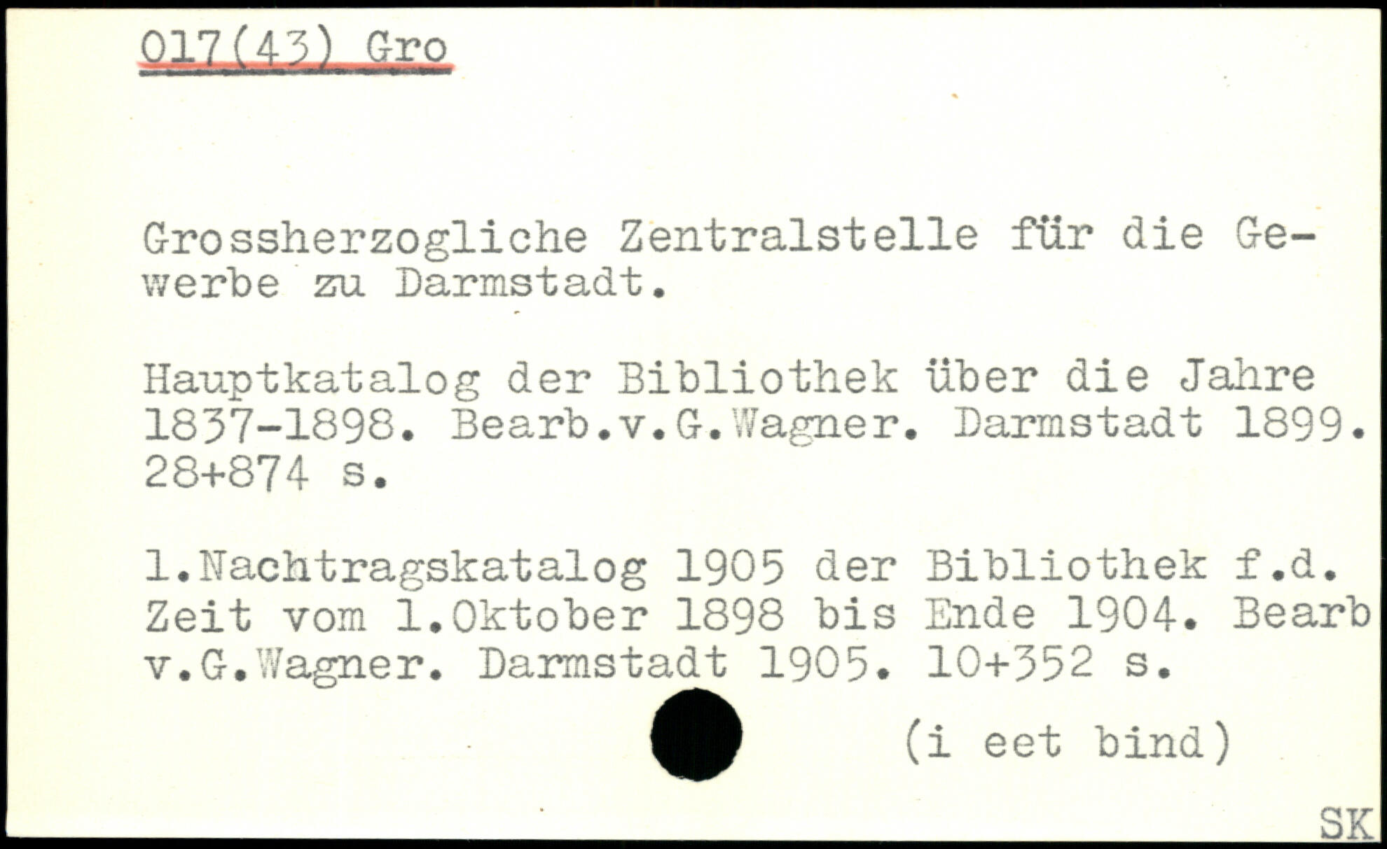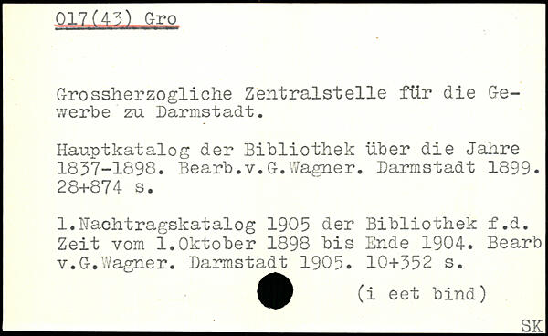 Grossherzogliche Zentralstelle für die Gewerbe zu Darmstadt. Hauptkatalog der Bibliothek über die Jahre 1837-1898. Bearb.v.G.Wagner. Darmstadt 1899.