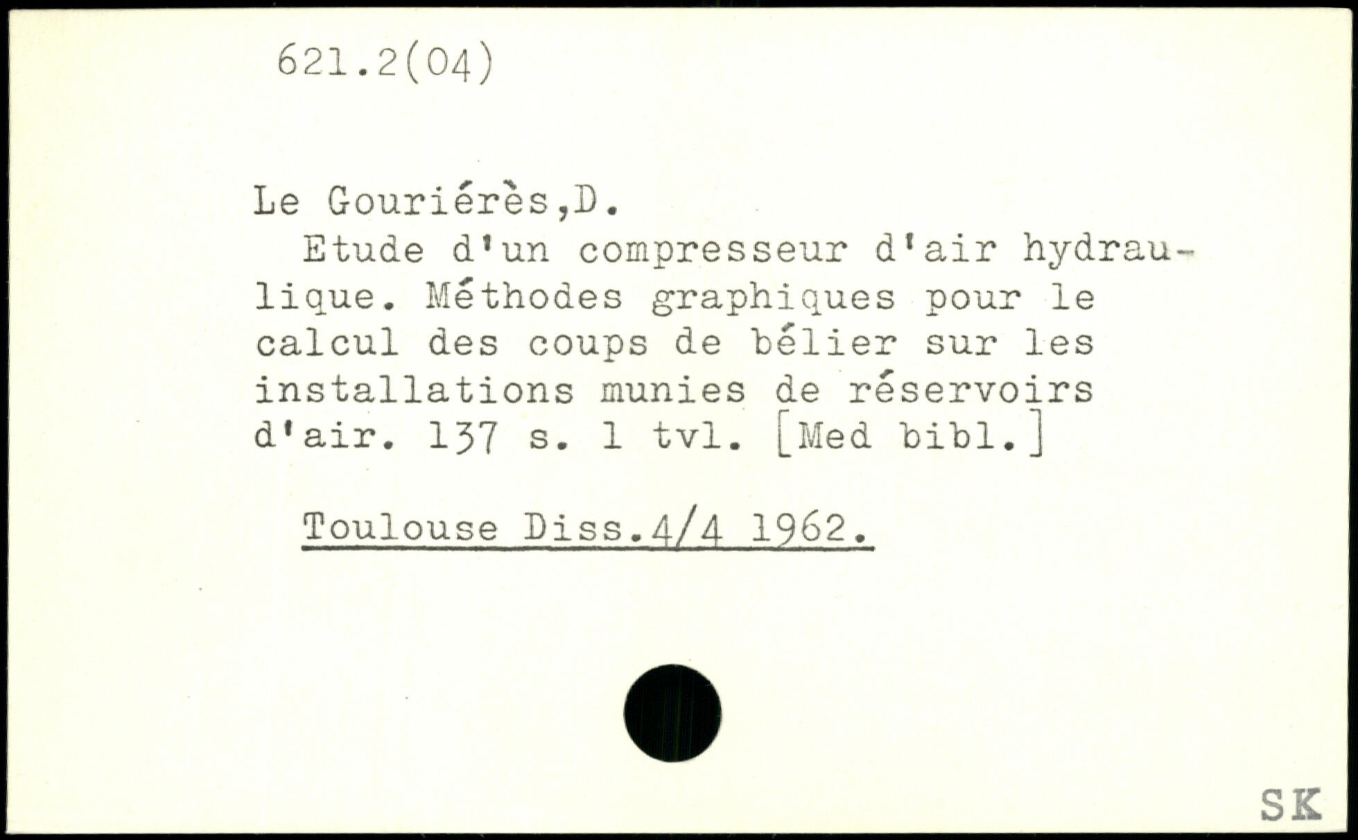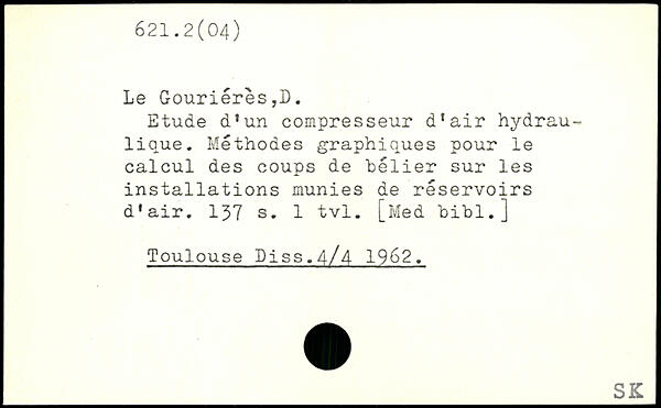 Le GouriéreSjD. Etude d'un compresseur d'air hydraulique. Méthodes graphiques pour le calcul des coups de bélier sur les installations munies de réservoirs d'air.