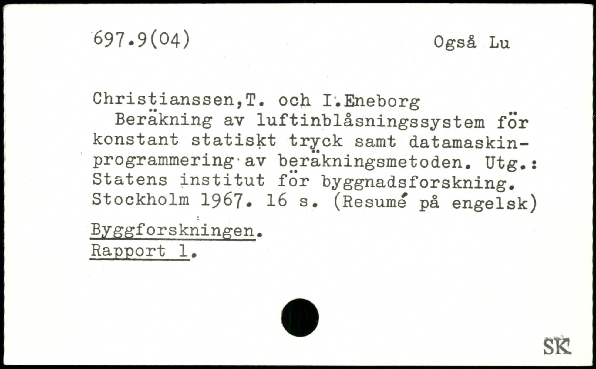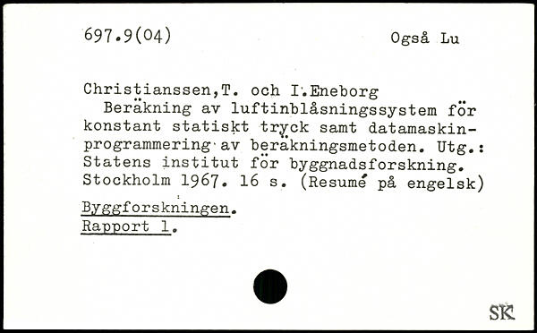 Beräkning av luftinblåsningssystem för konstant statiskt tr^ck samt datamaskinprogrammering' av beräkningsmetoden. Utg.: Statens institut for byggnadsforskning.
