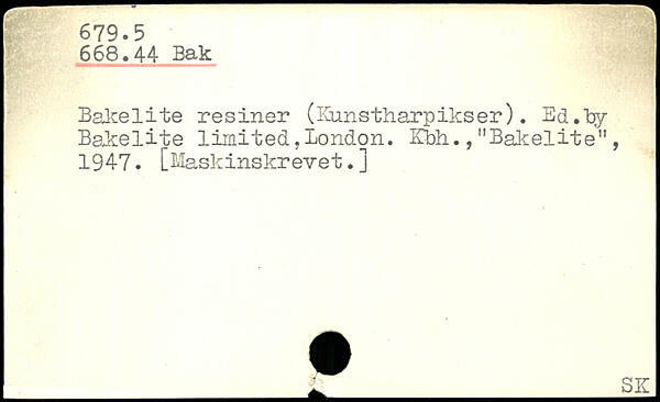Bakelite resiner (iCunstharpikser). Ed.by Bakelite limi'ted.London. Kbh.,"Bakelite", 1947. [Maskinskrevet.] _i, SK