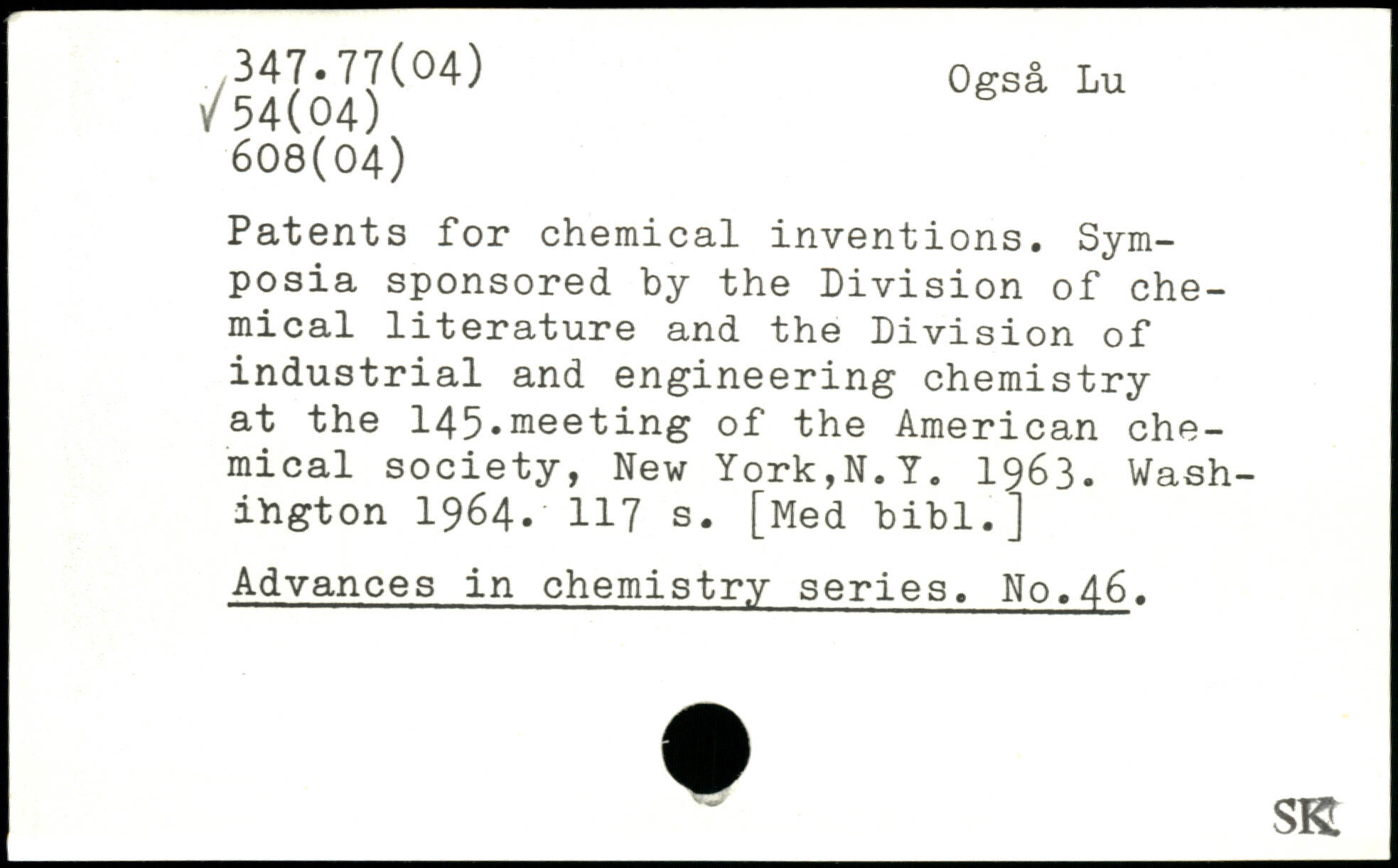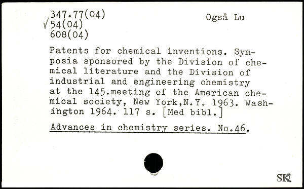 Patents for chemical inventions. Symposia sponsored by the Division of chemical literature and the Division of industrial and engineering chemistry at the 145.meeting of the American chemical society, New York,N.Y. 1963.