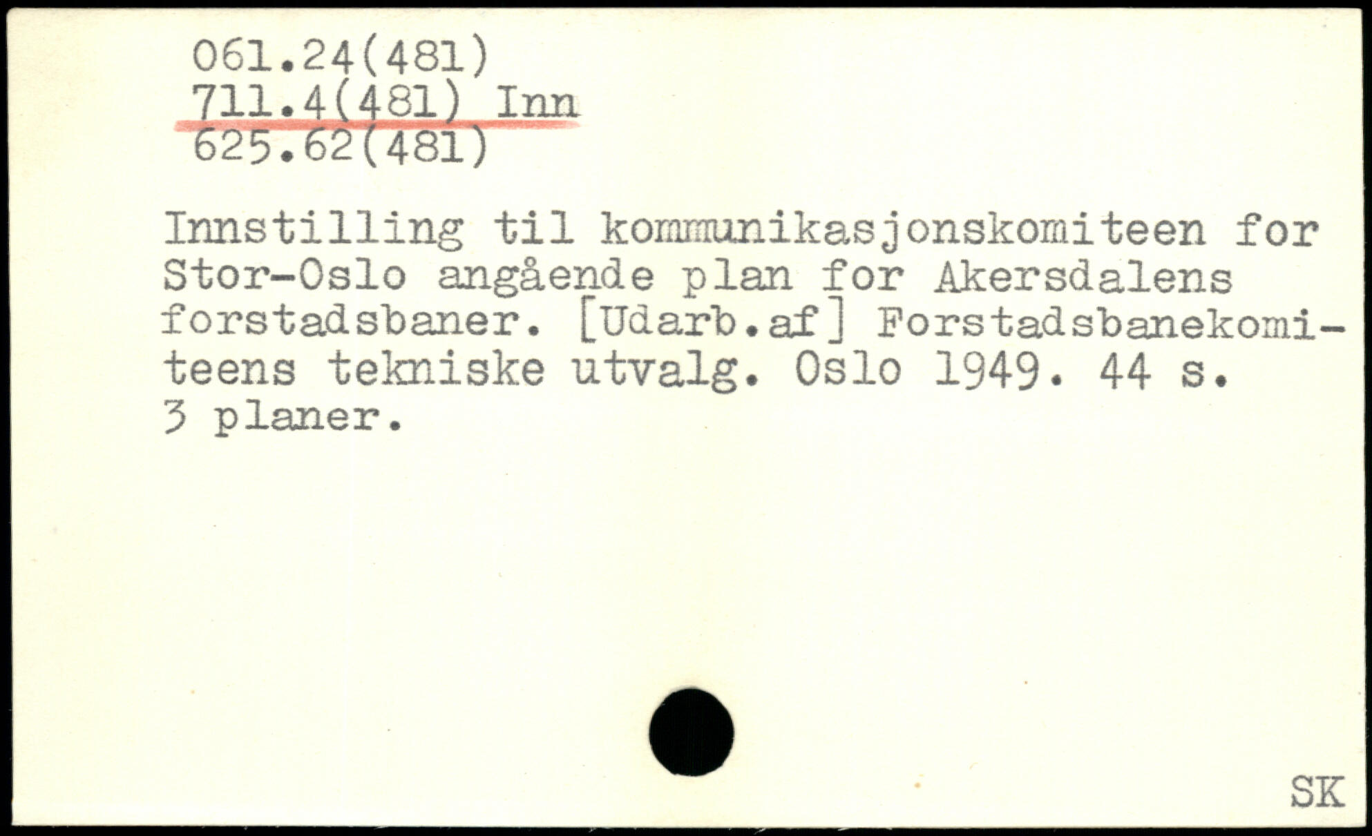 Innst1111ng til kommunikas jonskomiteen for Stor-Oslo angående plan for Akersdalens forstads'baner. [Udarb.af] Forstadsbanekomi-teens tekniske utvalg. Oslo 1949