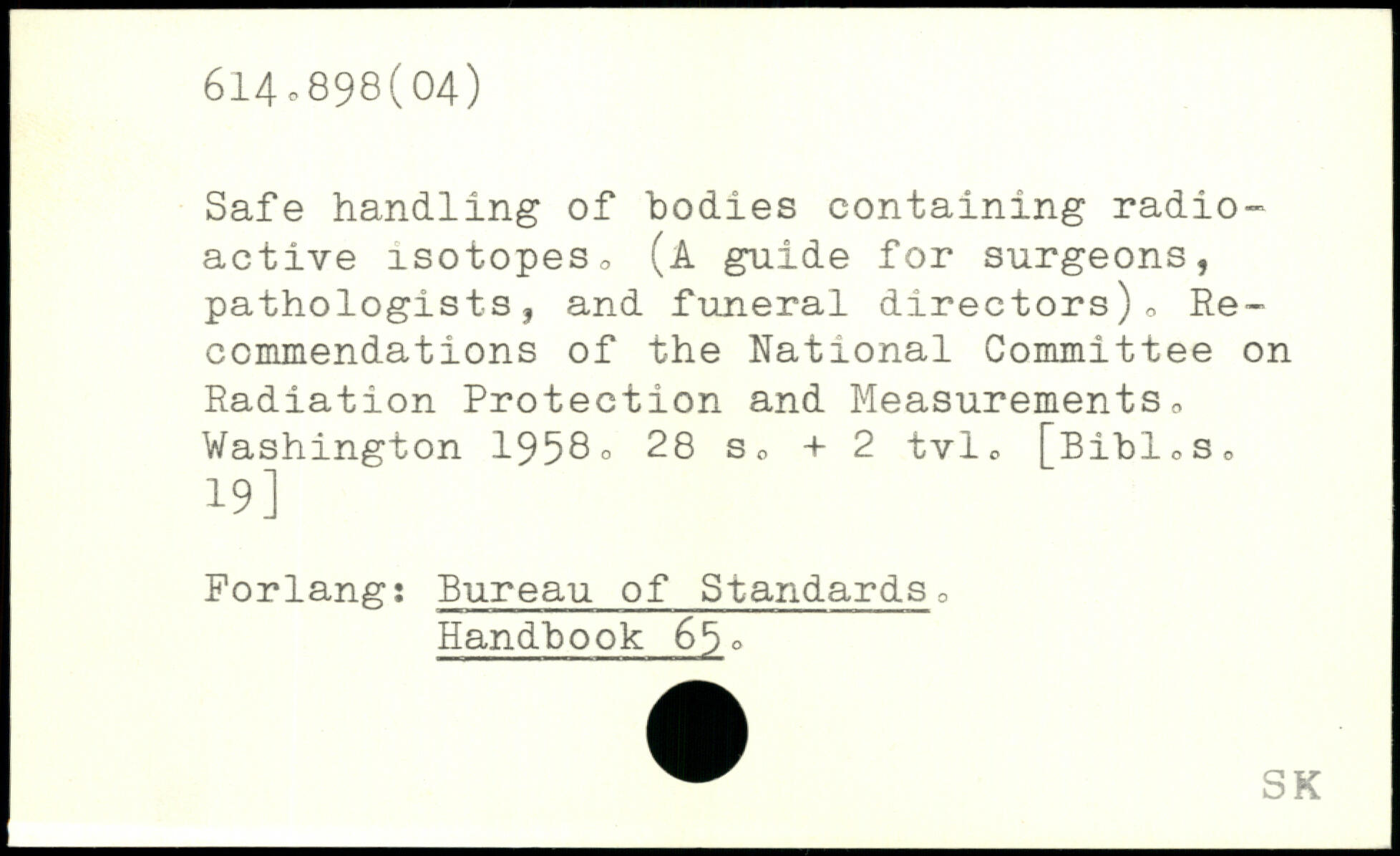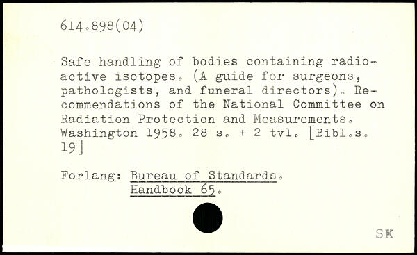 Safe handling of bodies containing radio-active isotopes. (A guide for surgeons, pathologists, and funeral directors). Recommendations of the National Committee on Radiation Protection and Measurements.