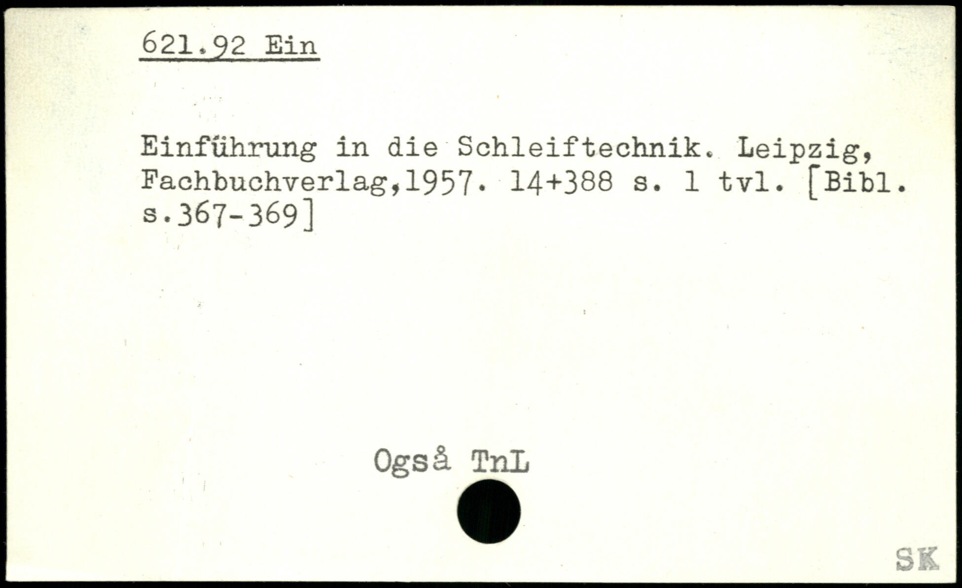 Einführung in die Schleiftechnik, Leipzig, Fachbuchverlag,1957. 14+388 s. 1 tvl. [Bibi, s.367-369] Ogsä Tnl