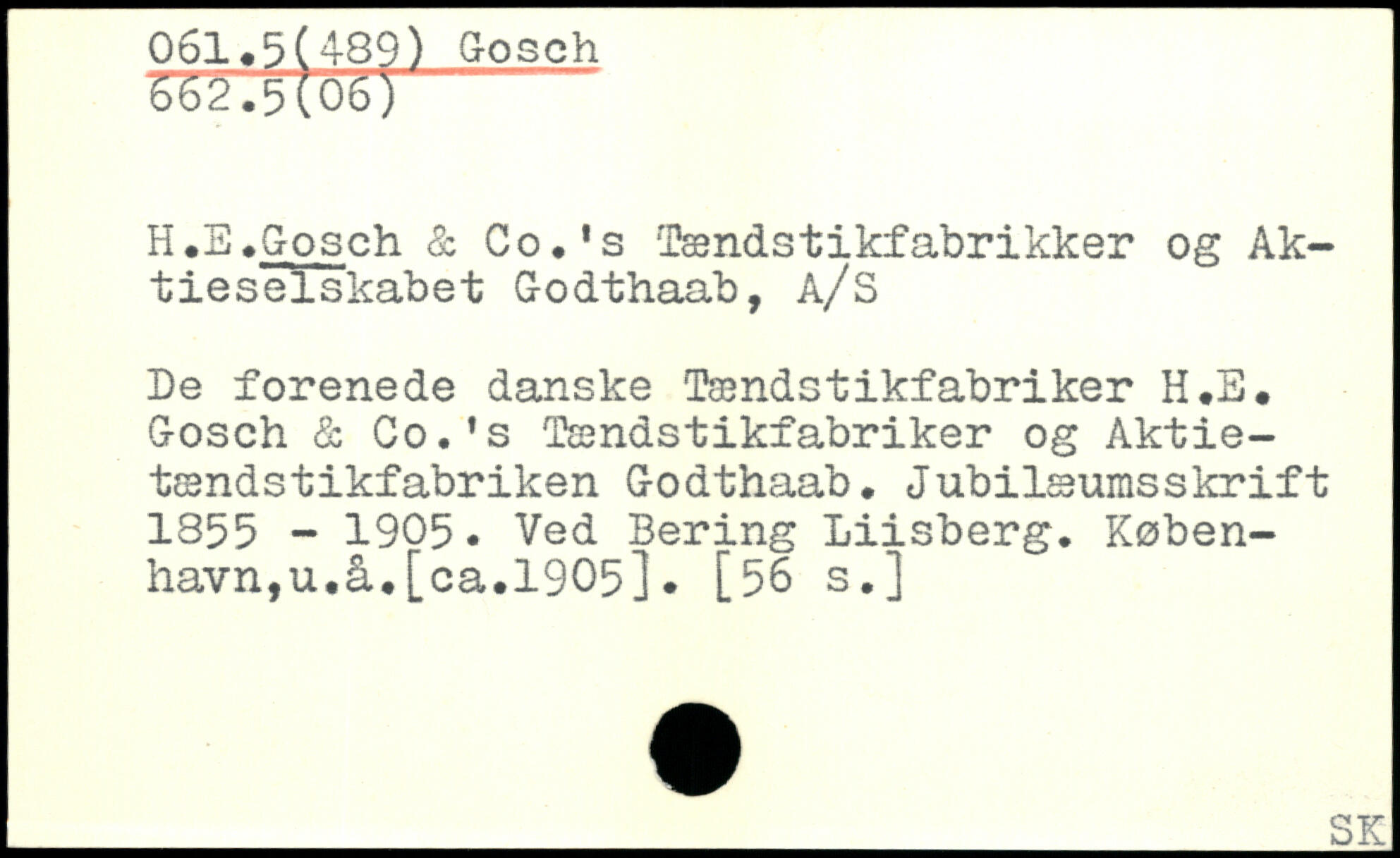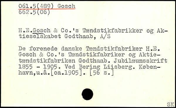 H.B.Gosch & Co.. s Tændstikfabrikker og Aktieselskabet Godthaab, A/S De forenede danske Tændstikfabriker H.E. Gosch & Co.'s Tændstikfabriker og Aktie-tændstikfabriken Godthaab, Jubilæumsskrift 1355 - 1905. Ved Bering Lüsberg. København, u.å.[ca.1905]. [