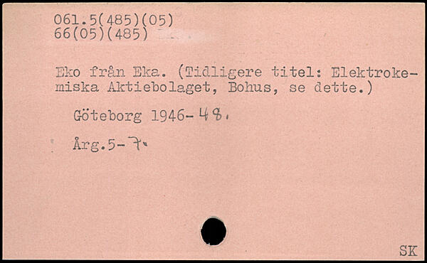 Eko från Eka. (fidligere titel: Elektroke-miska Aktiebolaget, Bohus, se öette.) Göteborg 1946- 4 .b. Årg.5-.4X